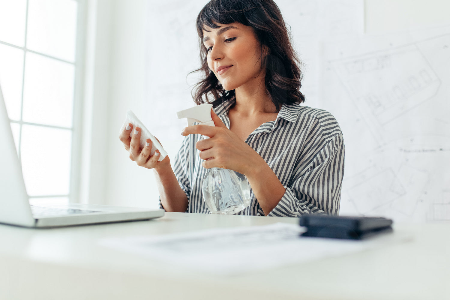 Close up of businesswoman sanitising workplace. Woman spraying sanitizer on a cleaning cloth.