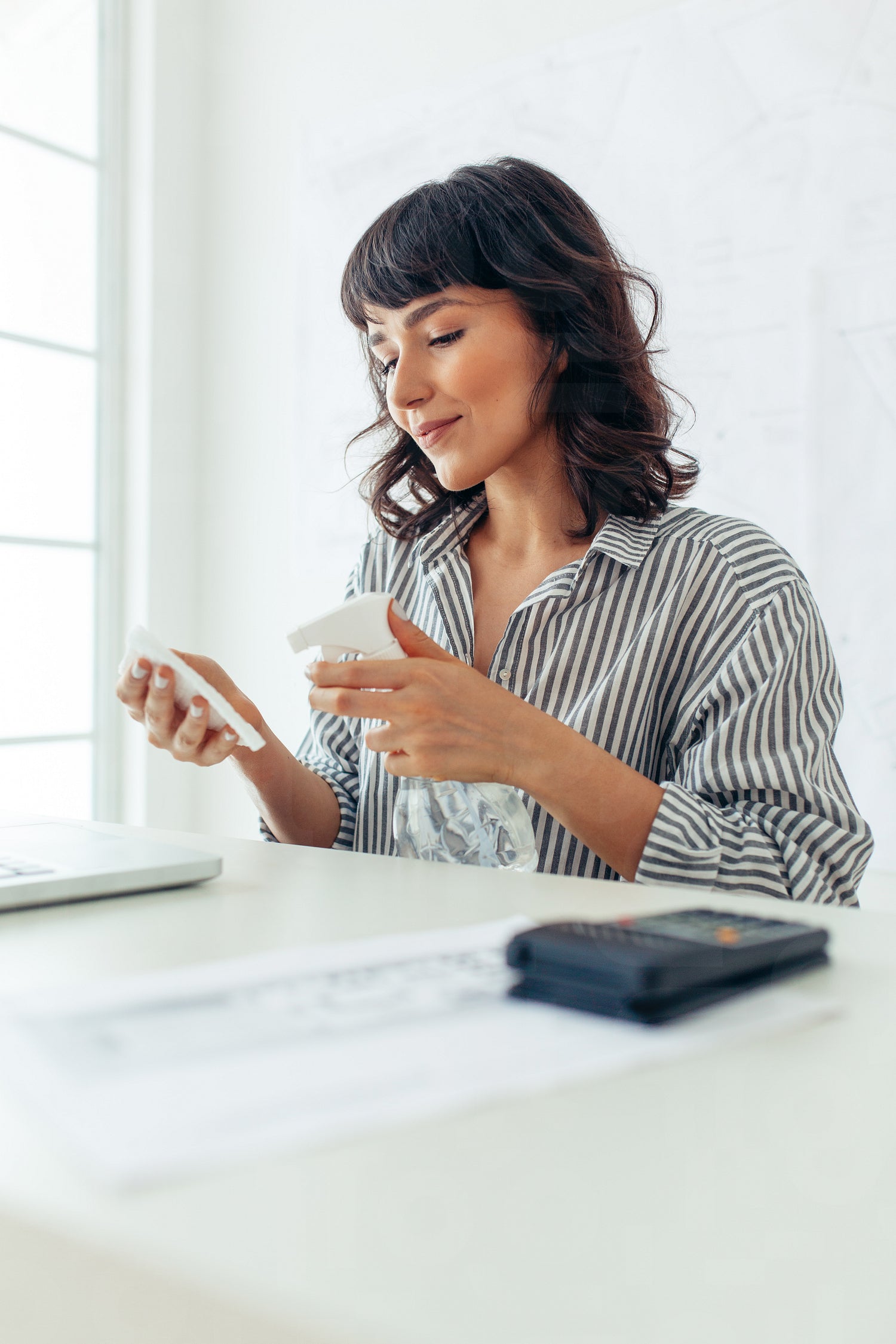 Close up of woman spraying sanitizer on a cleaning tissue. Businesswoman sanitizing workplace.
