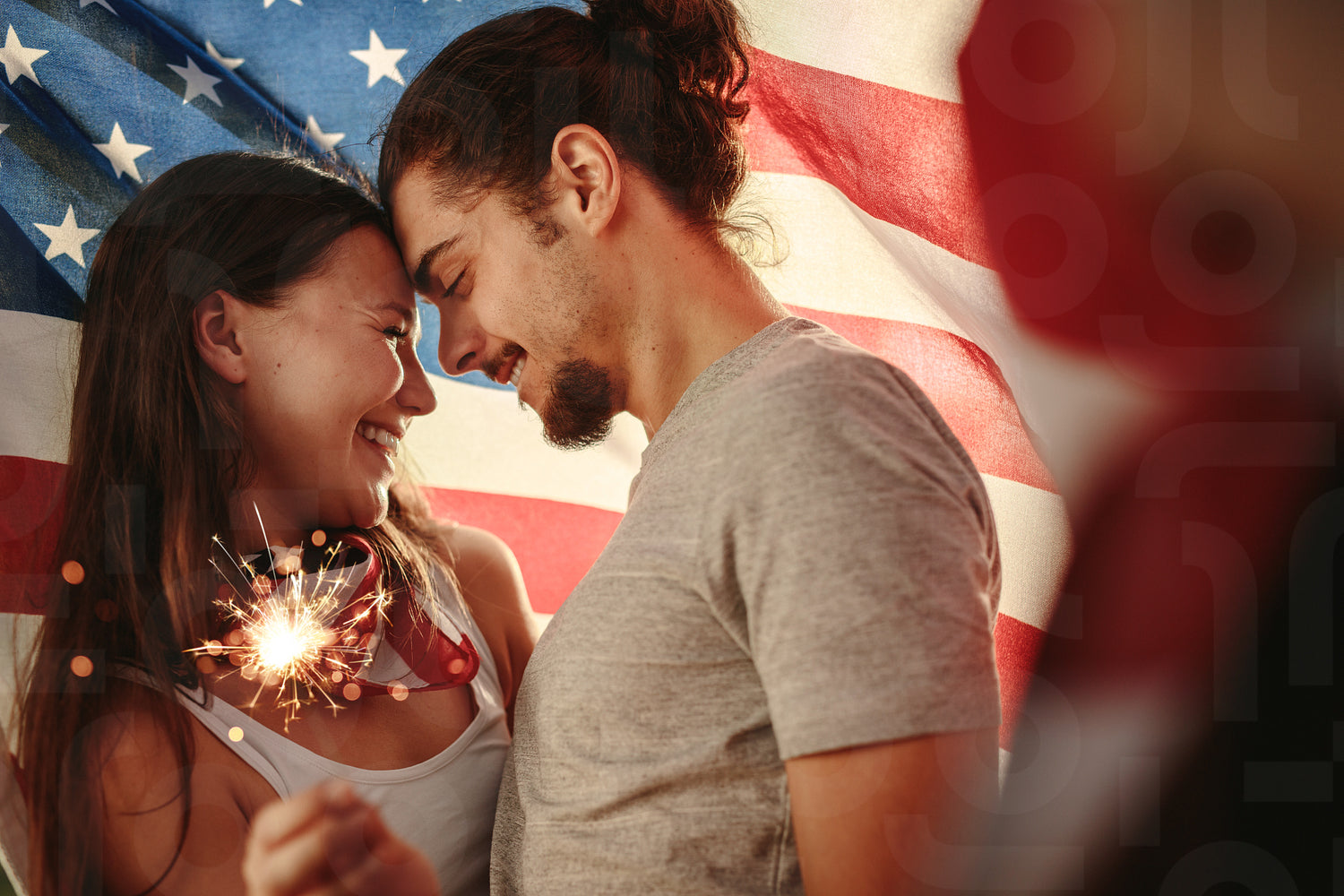 Loving couple holding sparklers wrapped under American flag. American man and woman celebrating independence day.