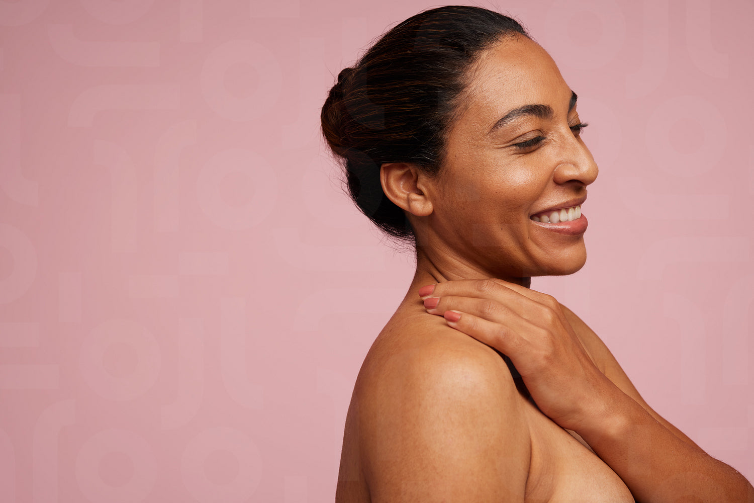 Side view of attractive woman smiling against pink background. Mixed race female with clean and clear skin.