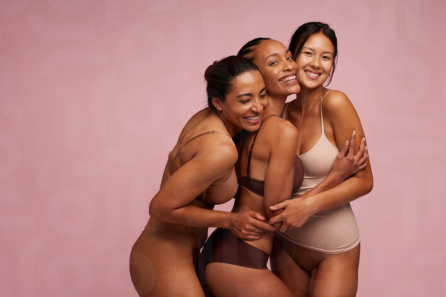 Group of three multiracial women in lingerie hugging each other. and smiling. Diverse group of woman in underwear on pink background.