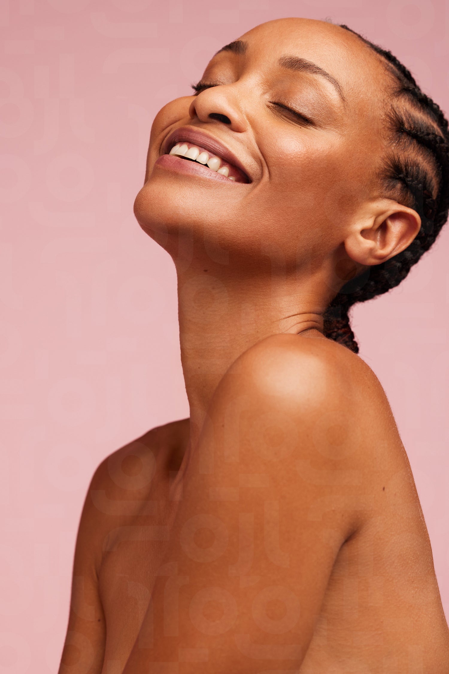 Close-up of a smiling female model with healthy skin on pink background. African woman having flawless skin.