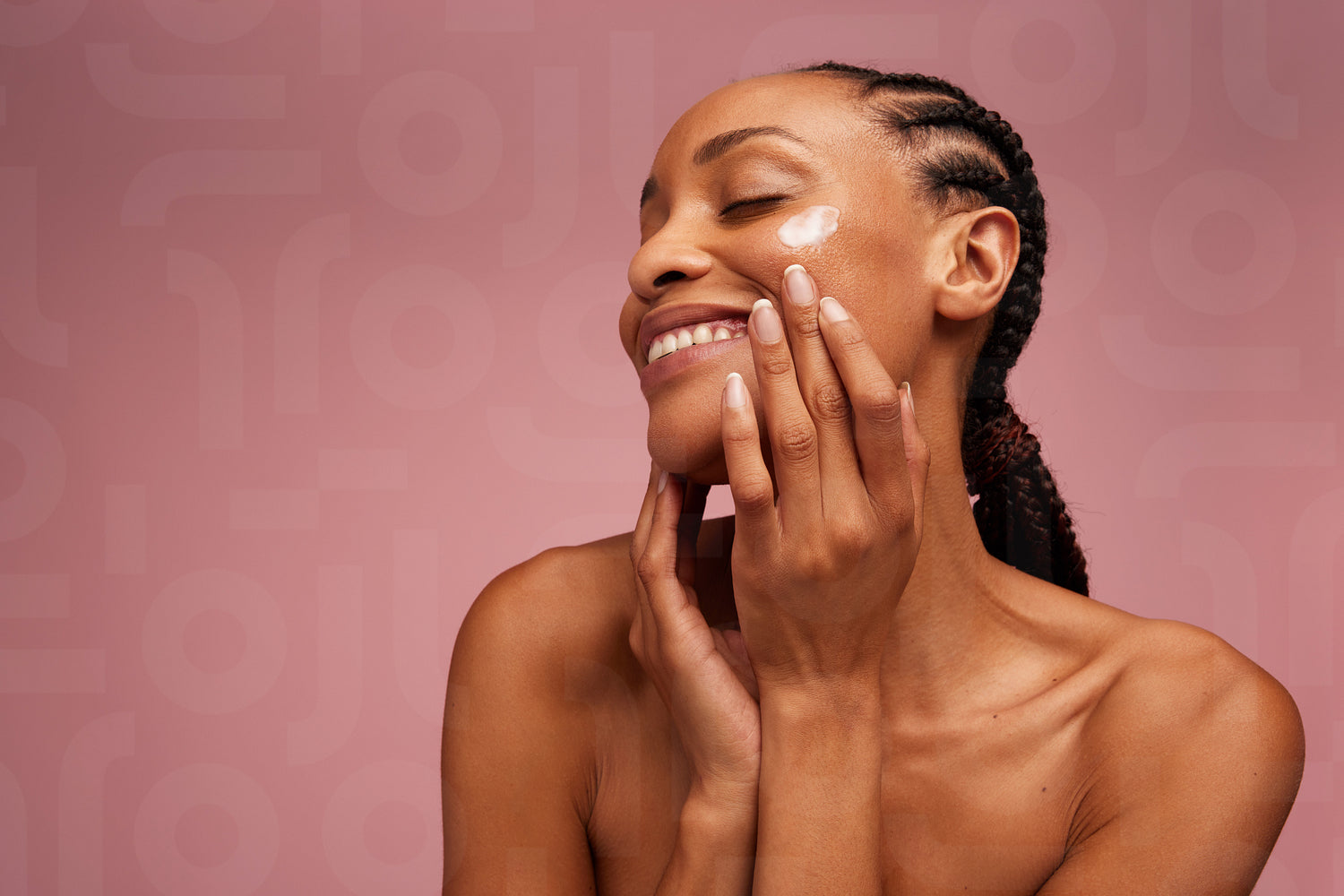 Beautiful woman eyes closed while applying moisturizer to her face. Woman applying face cream against pink background.