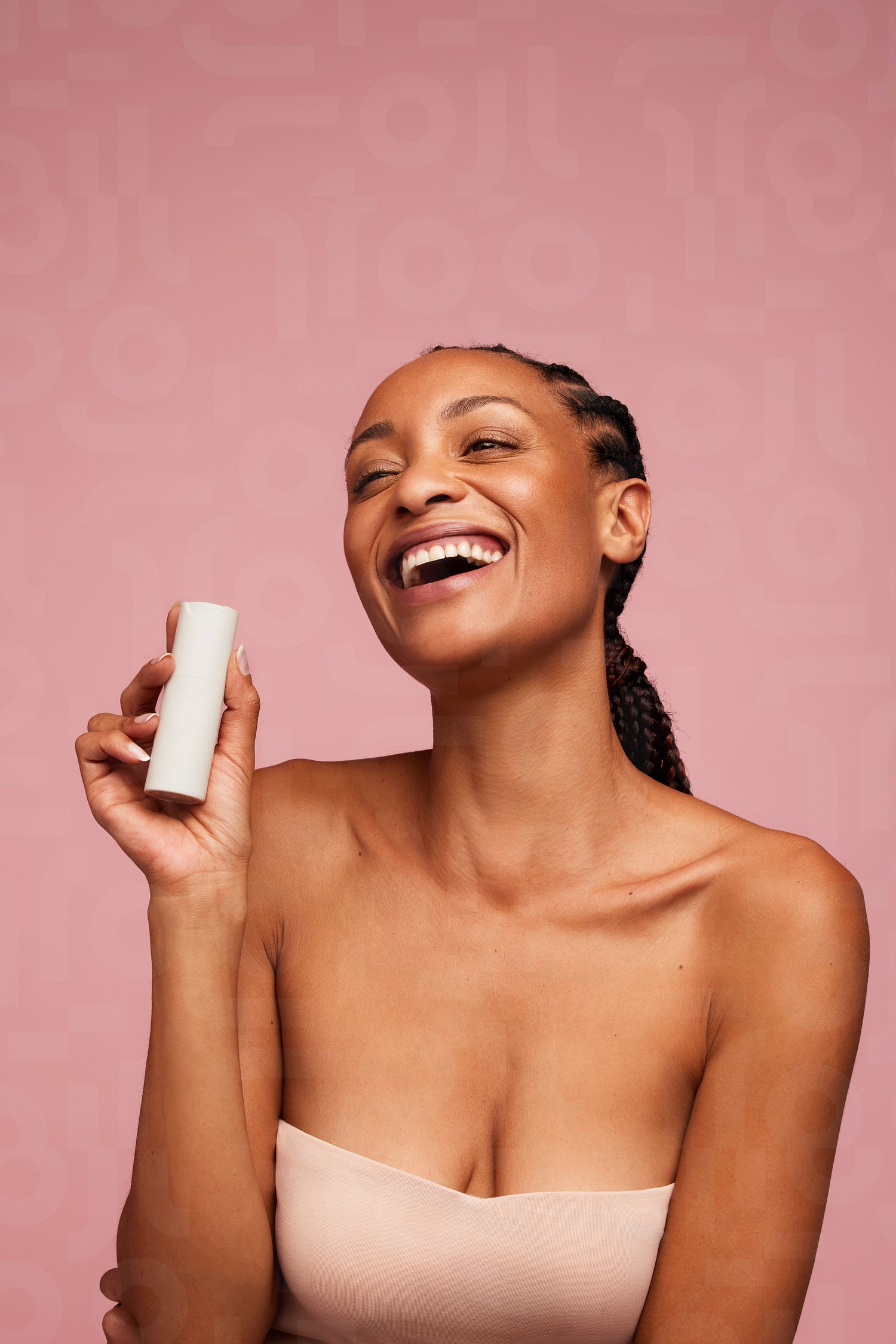 Portrait of african woman holding a skincare product and smiling. Attractive woman with beautiful skin holding a cosmetic cream bottle.