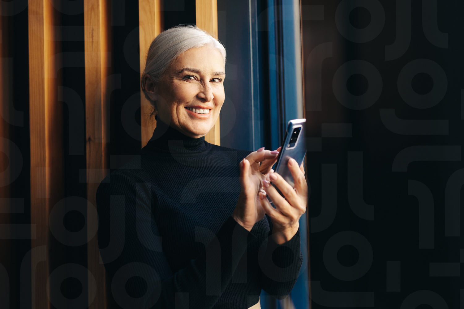 Senior woman keeping up with the modern way of working, she uses her smartphone for business purposes, making phone calls to her business clients and colleagues in order to achieve success.