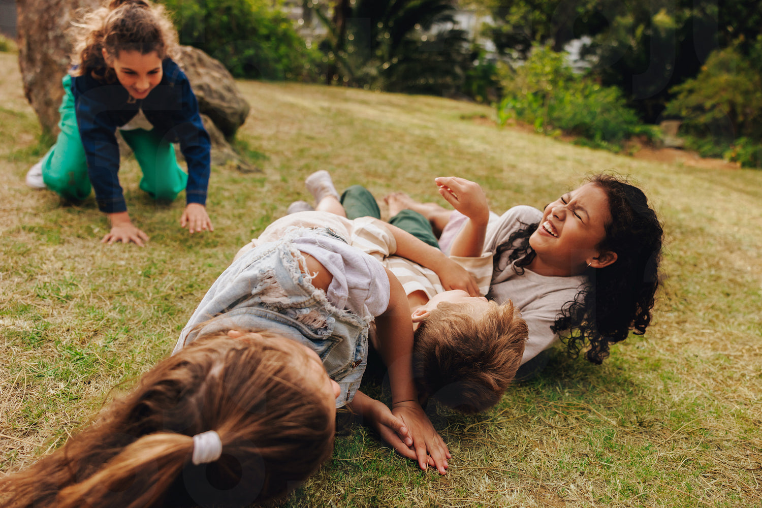Group of joyful children laughing and playing together on grass in a park