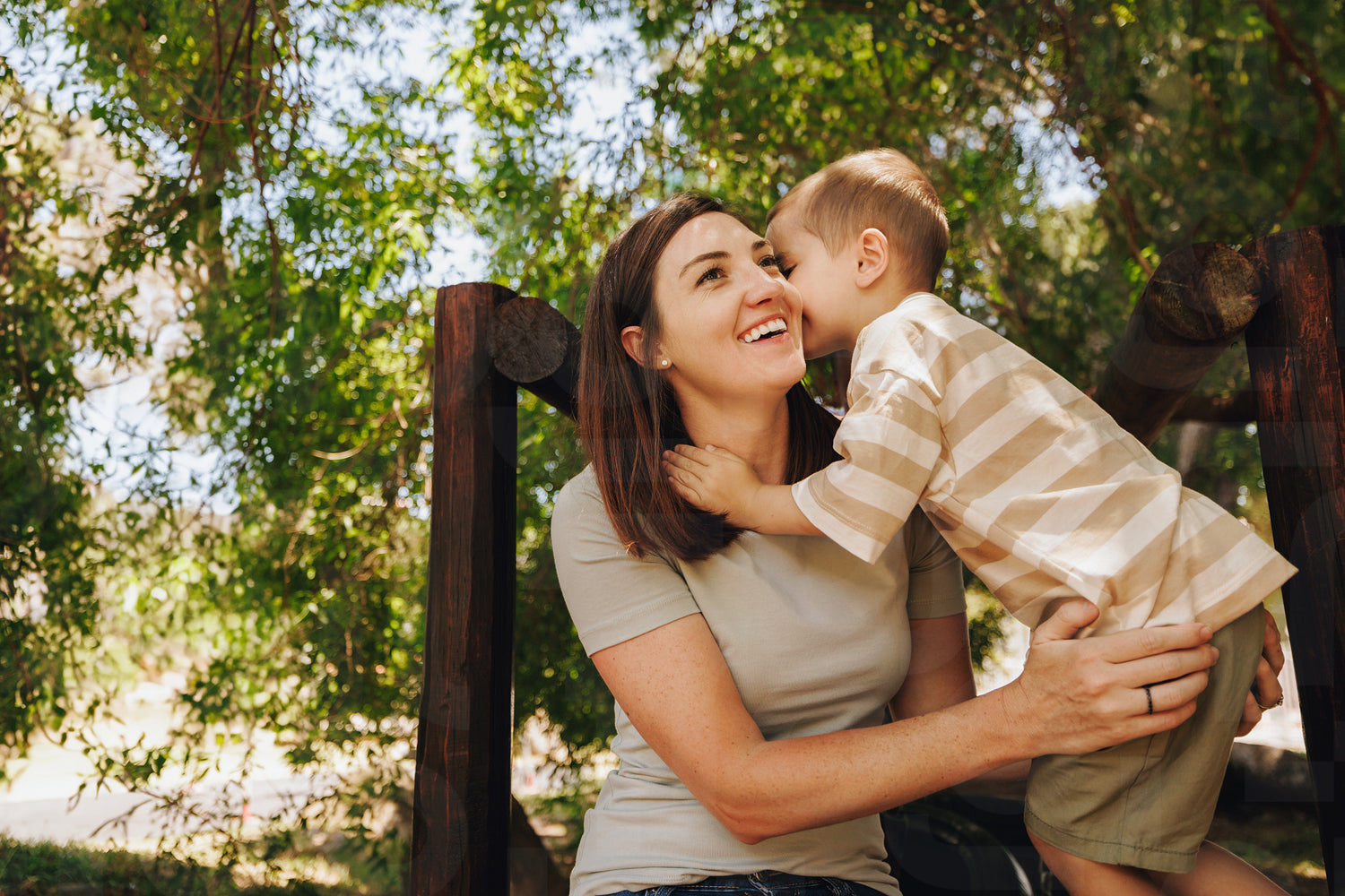 A loving interaction of a mother and son as they share a secret outdoors. Bathed in sunlight under leafy trees, their closeness and fascination create a moment capturing the warmth of familial love.