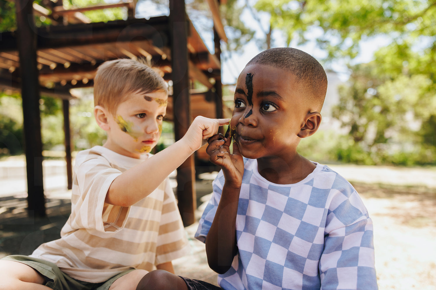 Two boys interact outdoors on a sunny day, playfully painting each other's faces in a fun and creative activity. The setting is a natural environment, enhancing the joyous and imaginative experience.