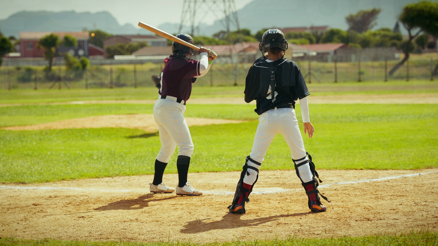 A baseball player connects with a pitch, drops her bat, and sprints towards first base. Displays athletic prowess and determination in the game.