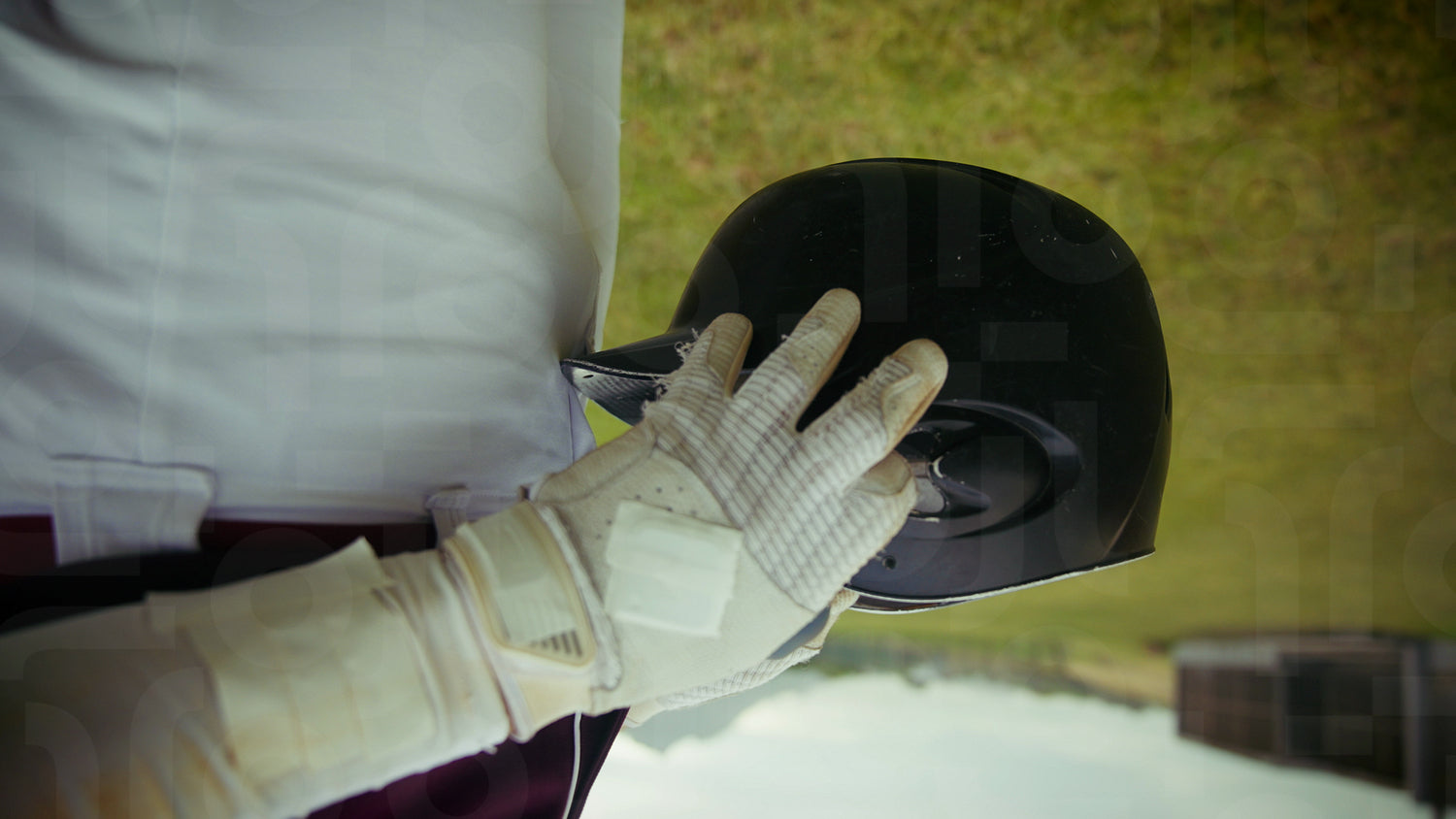 A baseball player dons his helmet on the field. He stands focused, ready for competition. His determined expression shows commitment to the game and sport. Preparation for play.