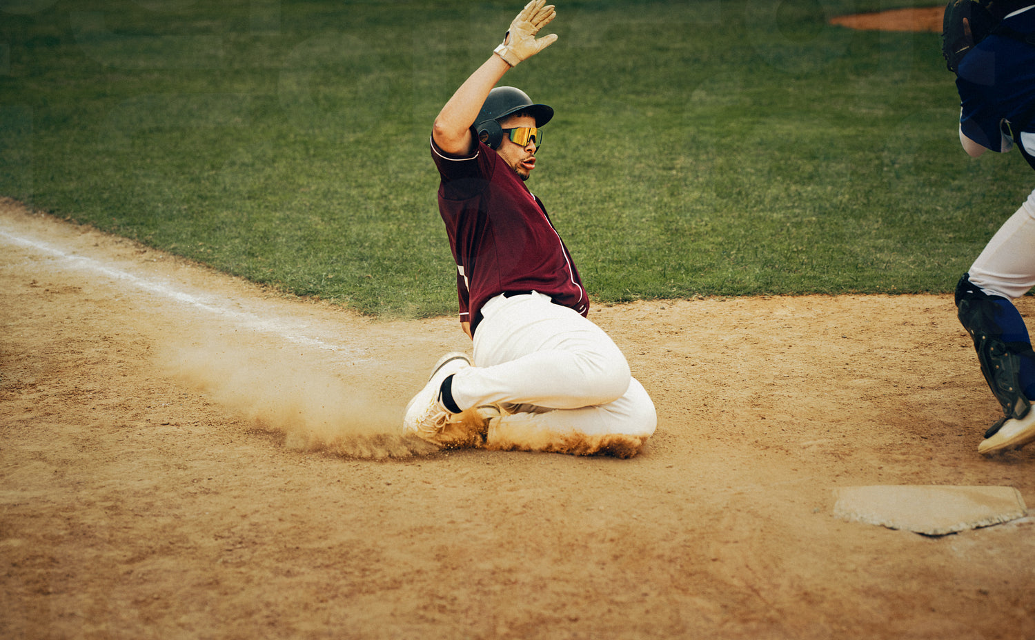 A baseball player slides into home plate amid dust, showcasing determination and skill during a competitive match. This photo has intentional use of 35mm film grain.
