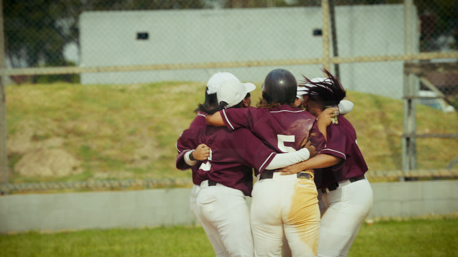Female baseball players huddle in celebration on the diamond after a victorious play. Their camaraderie and joy are evident as they embrace this winning moment.