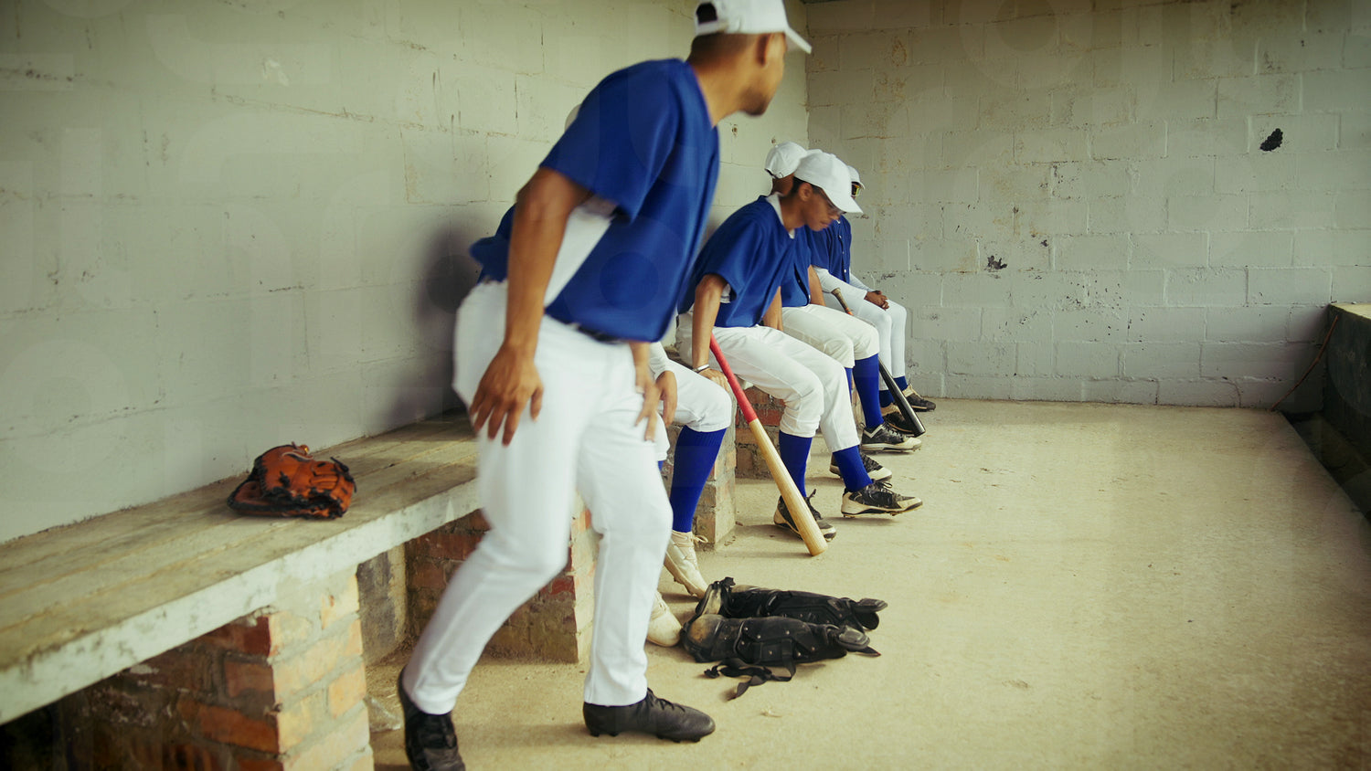 Baseball players in blue uniforms wait and watch intently from the team dugout, ready for their turn on the field. Their equipment is ready nearby.