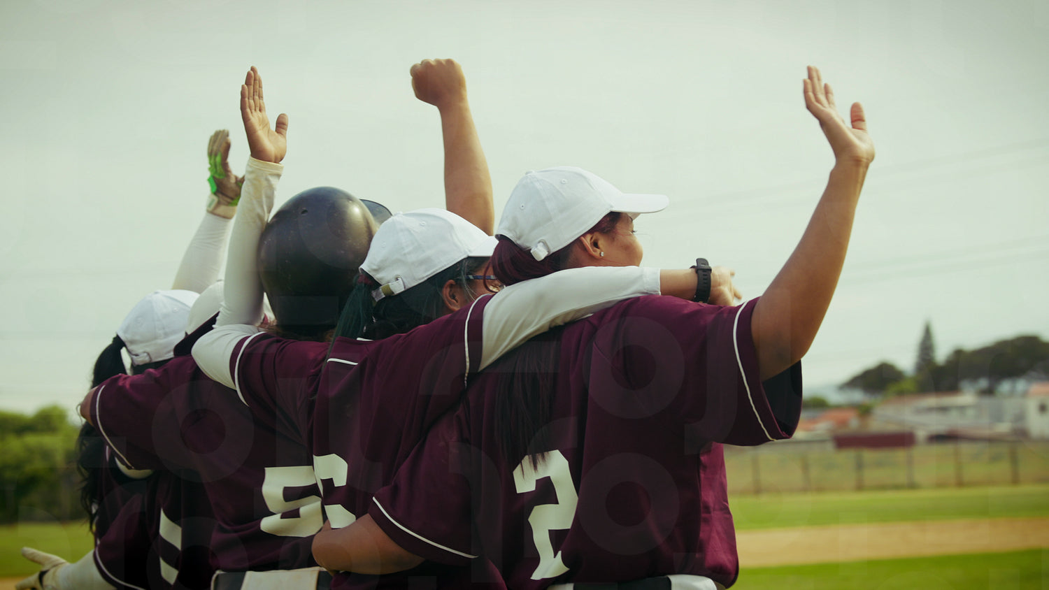 A female baseball team celebrates a triumphant moment on the field. The players embrace, raising their arms in unity after a successful play, showcasing strong teamwork and camaraderie.