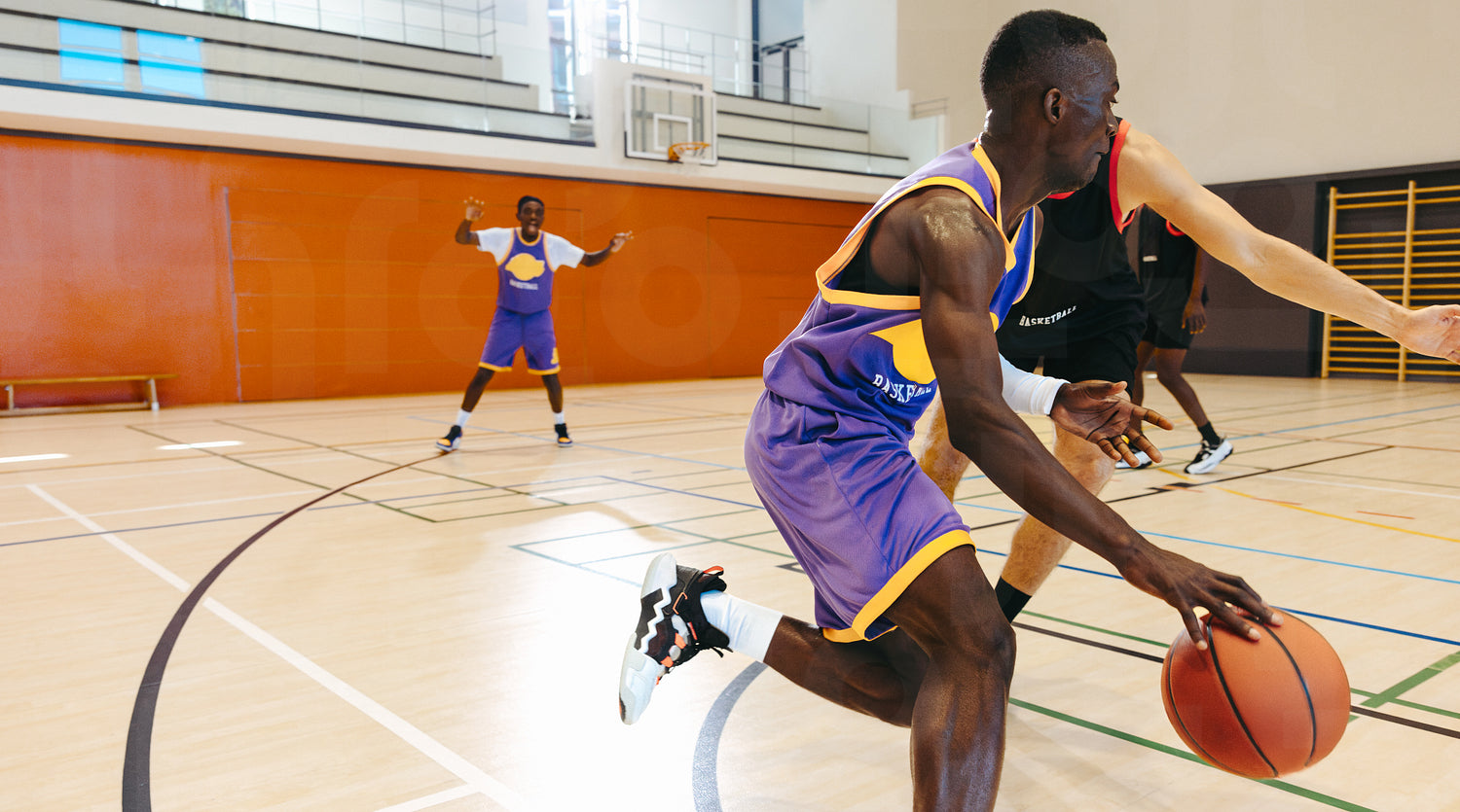Energetic basketball match with young men in action on an indoor court, showcasing athleticism, coordination, and teamwork in a competitive and vibrant sporting environment filled with enthusiasm.