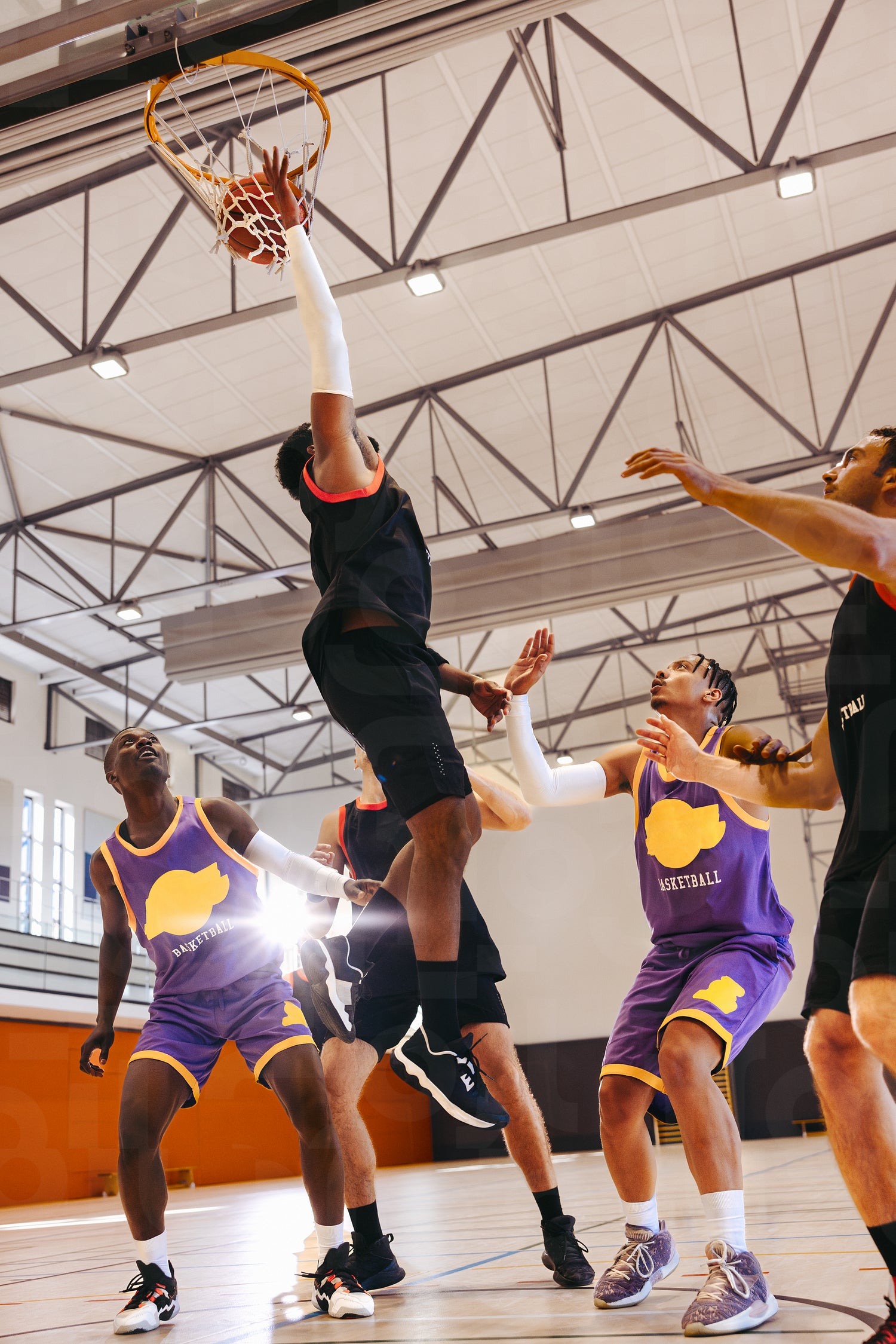 Basketball players in action on an indoor court, focusing on an athlete performing a dunk while surrounded by teammates and opponents, emphasizing teamwork, energy, and competition during a game.