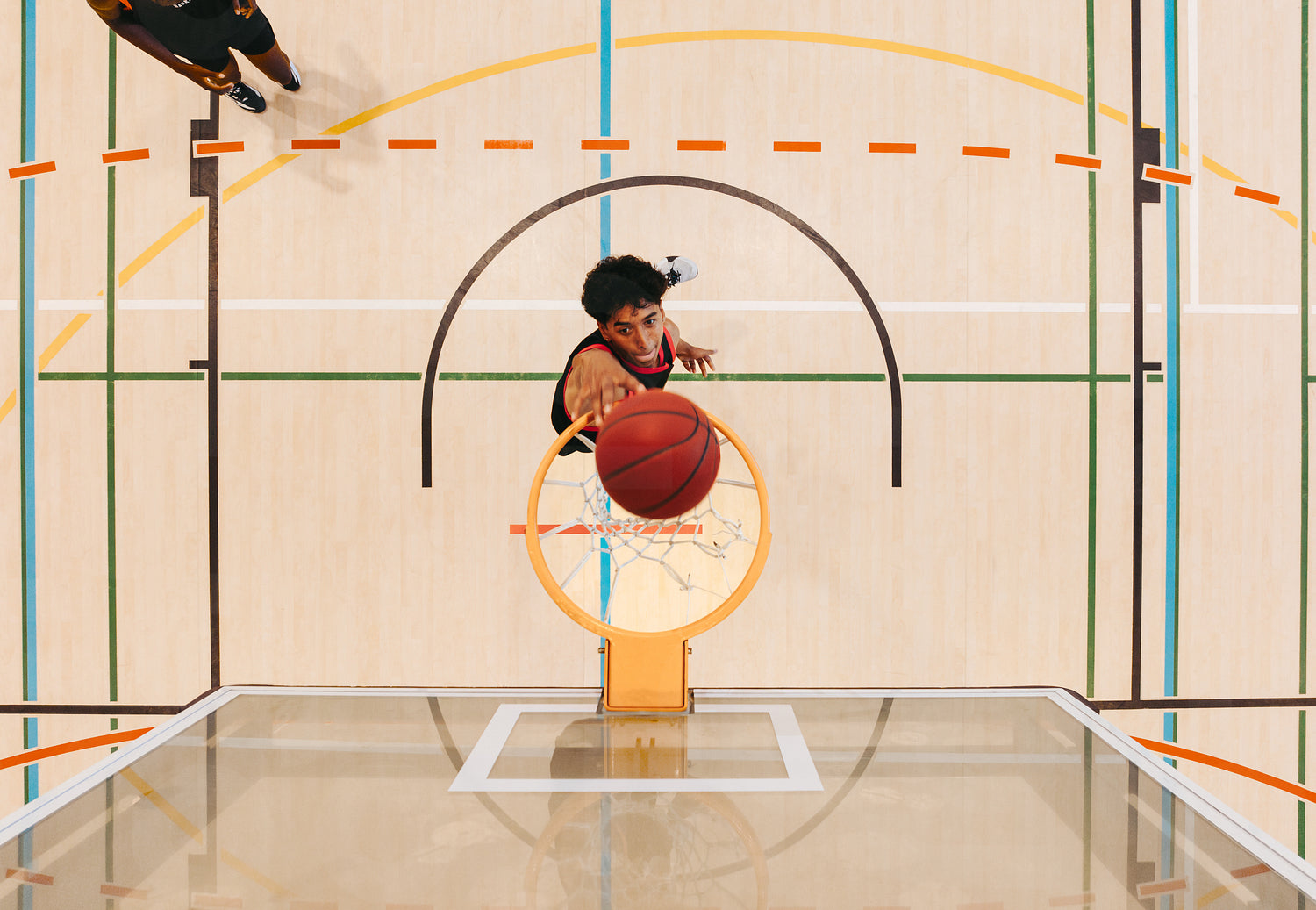 Overhead shot of a basketball player aiming for the hoop, highlighting focus, scoring action, and competitive energy on a colorful indoor court.