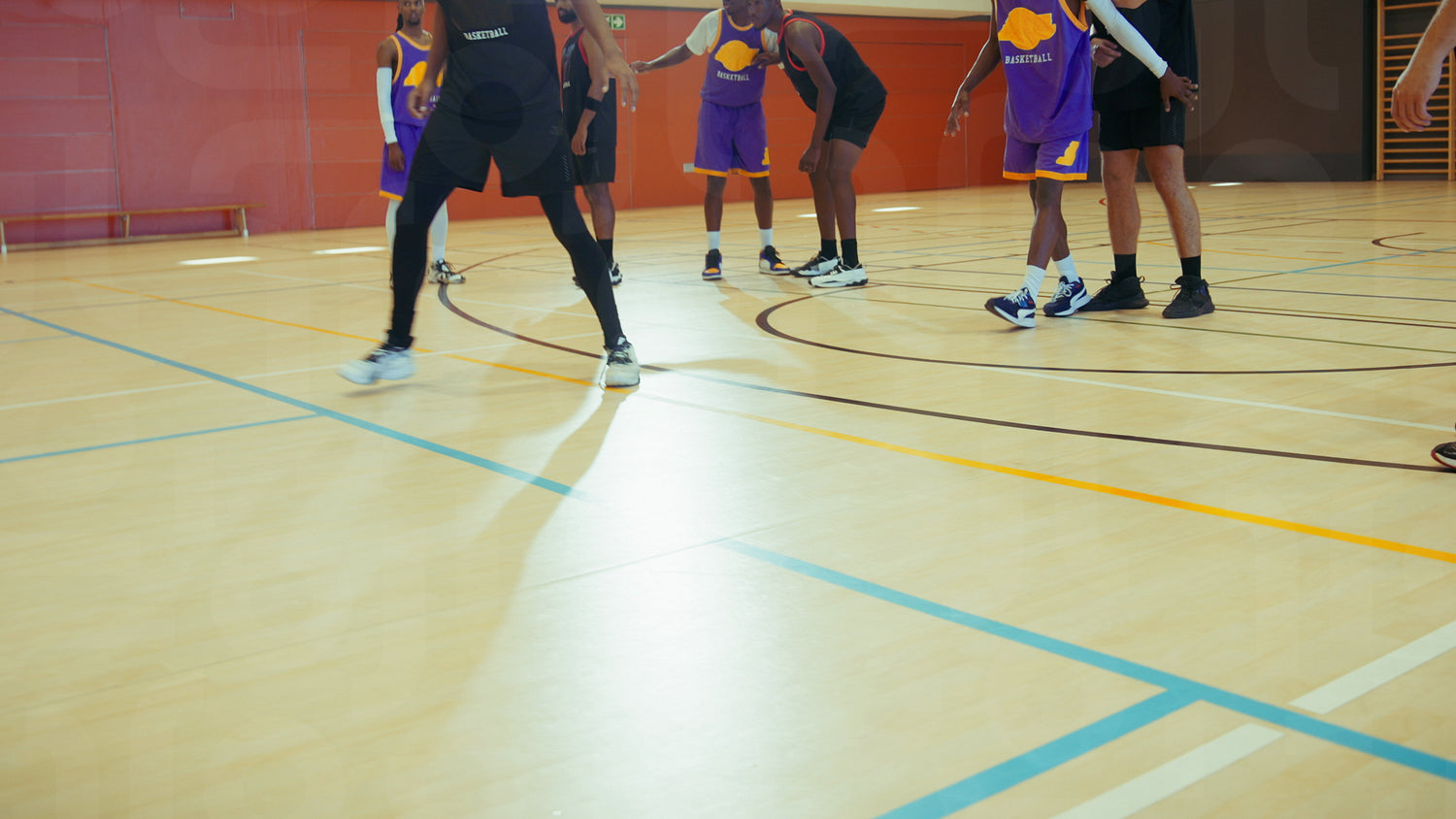 Young male athletes practice basketball on an indoor court, showcasing agility and teamwork. Their dynamic movements and passion for the sport create an energetic and engaging scene.