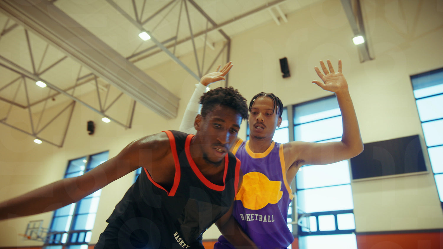Two young men intensely practice basketball on an indoor court. They showcase dynamic dribbling and focused defense, embodying athletic training and skill.