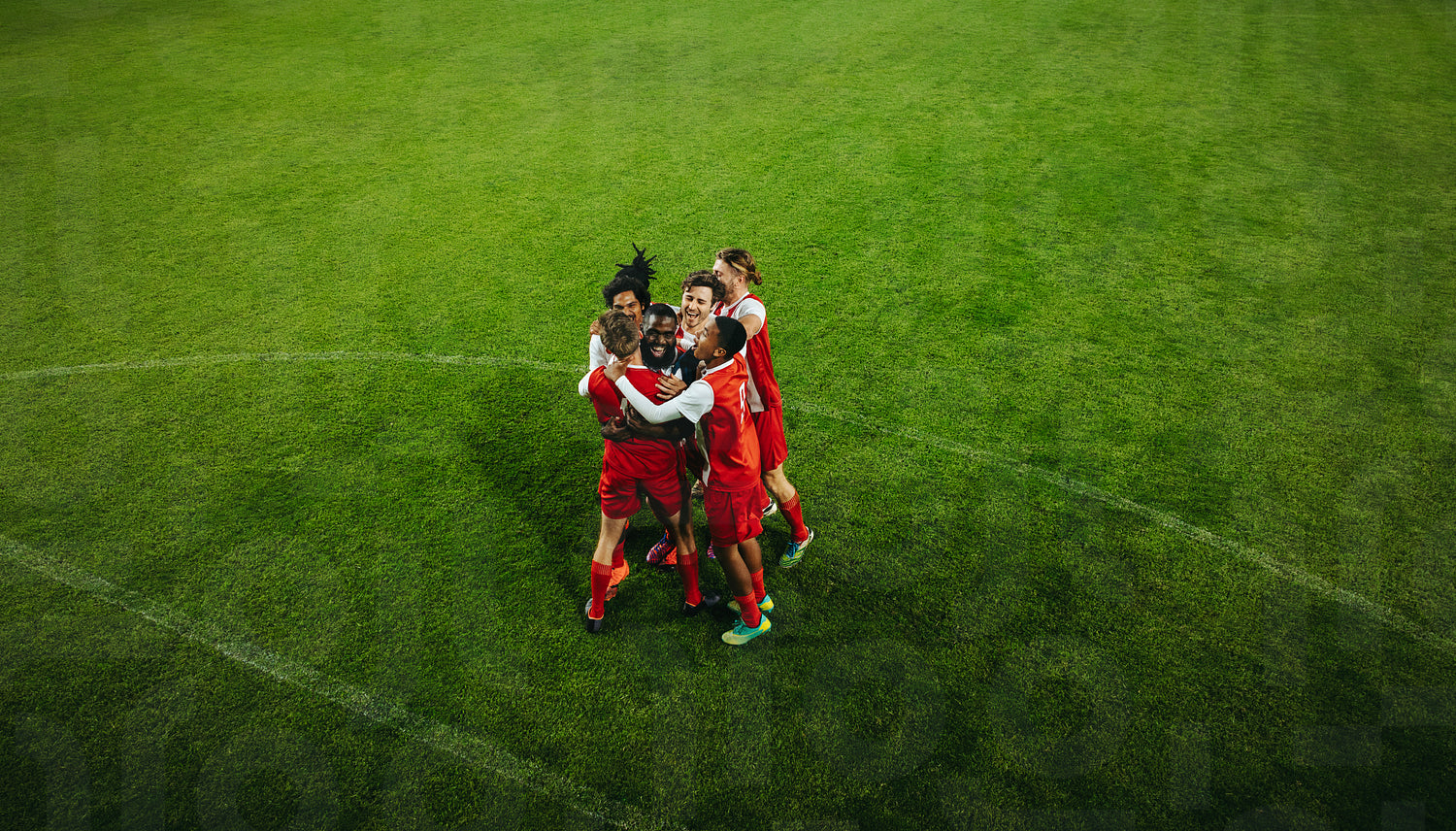 A jubilant football team celebrates together on the field after scoring a goal, depicting teamwork and victory in a professional match.