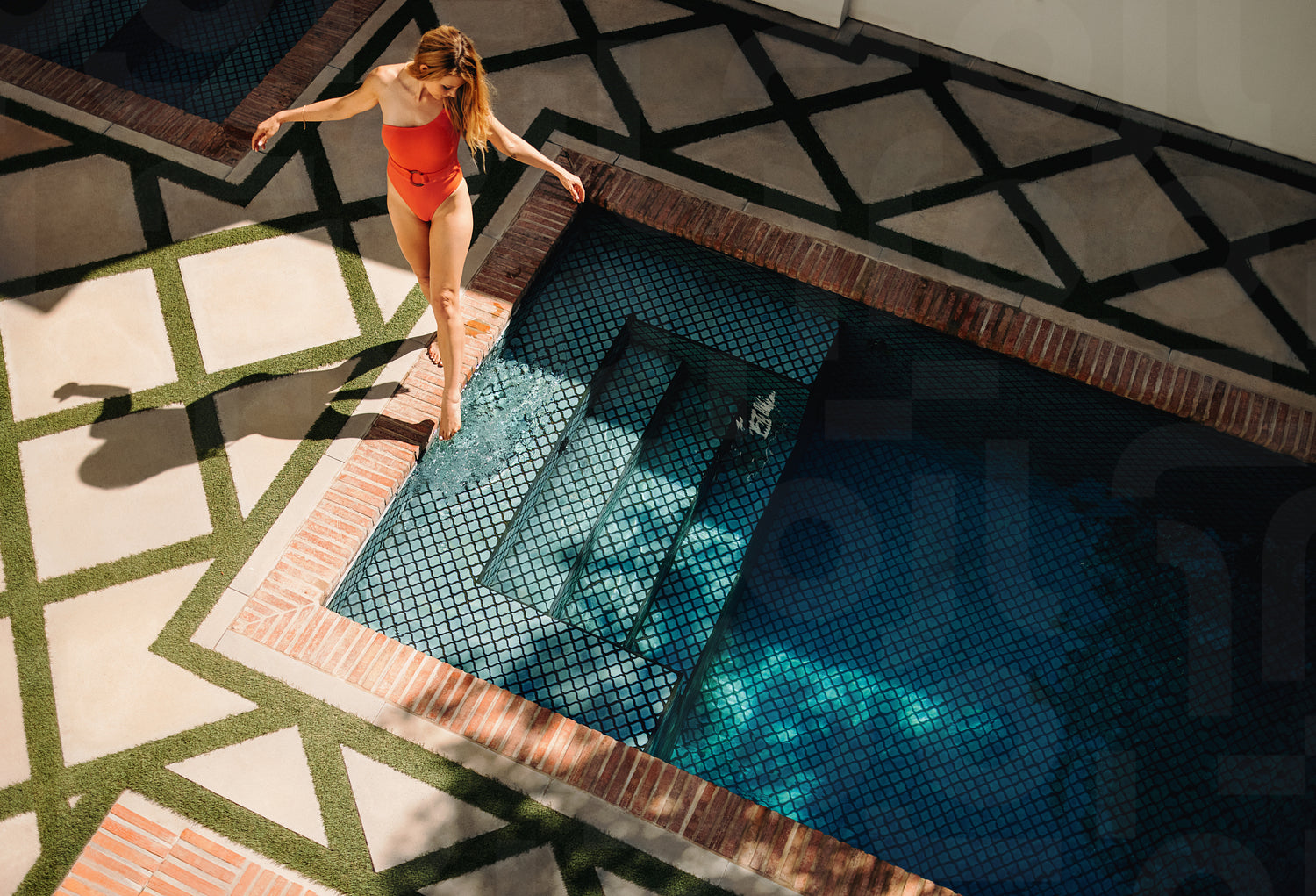 Aerial view of a woman standing next to a pool in red swimwear. Tourist woman feeling the swimming pool water with her foot. Woman vacationing at a luxury holiday resort in the summer.