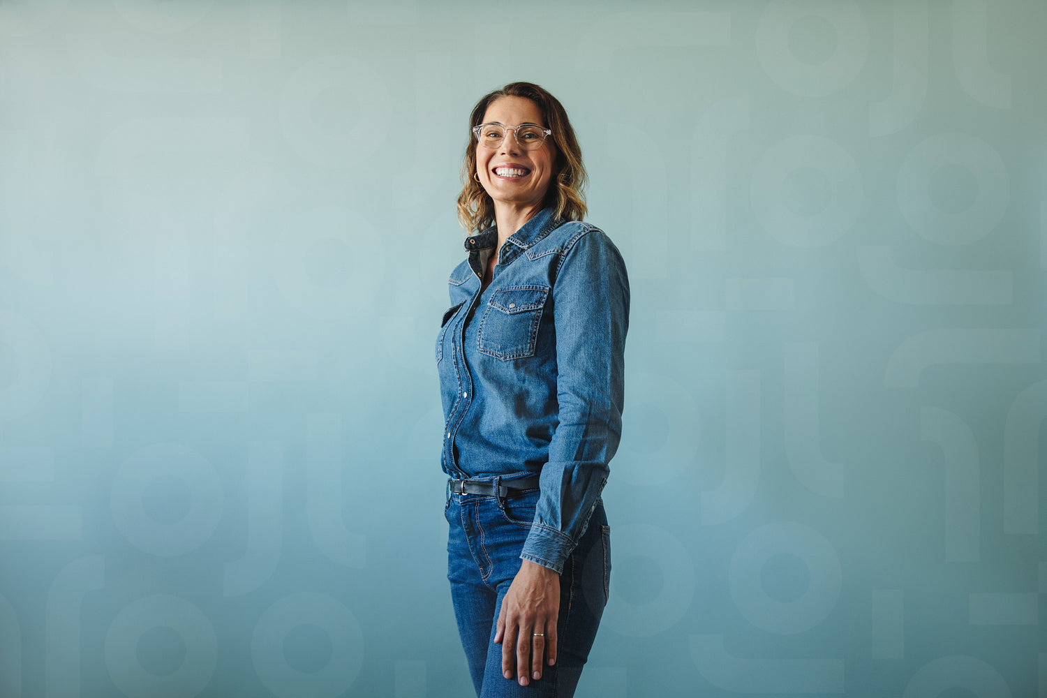 Female entrepreneur, wearing a denim outfit, presents a happy and engaging smile as she looks directly at the camera. Her professional demeanor and positive expression convey success and competence in her business endeavors.