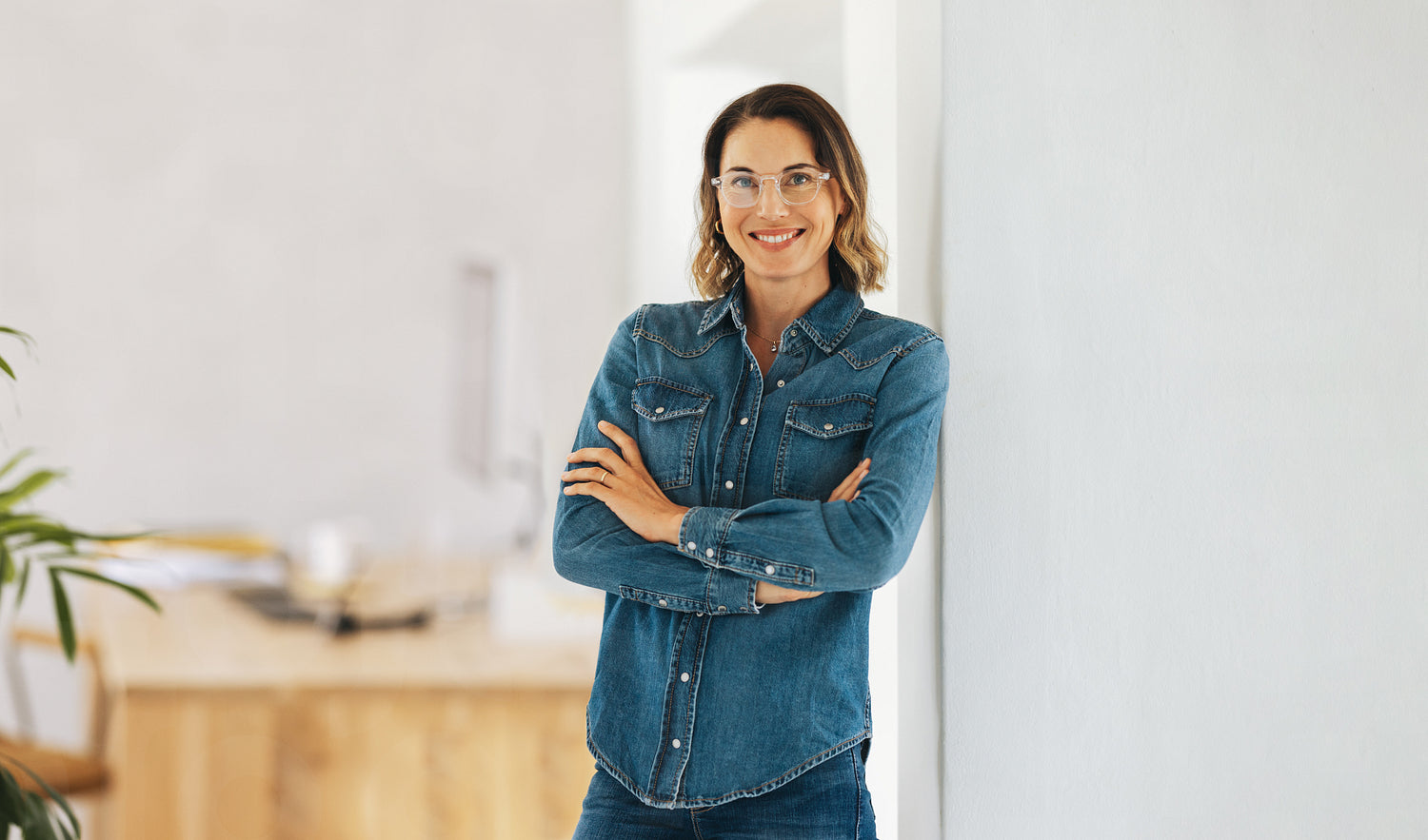 Caucasian business woman stands in her office smiling and looking at the camera; proud of her entrepreneurial spirit and success in the competitive world of freelance.