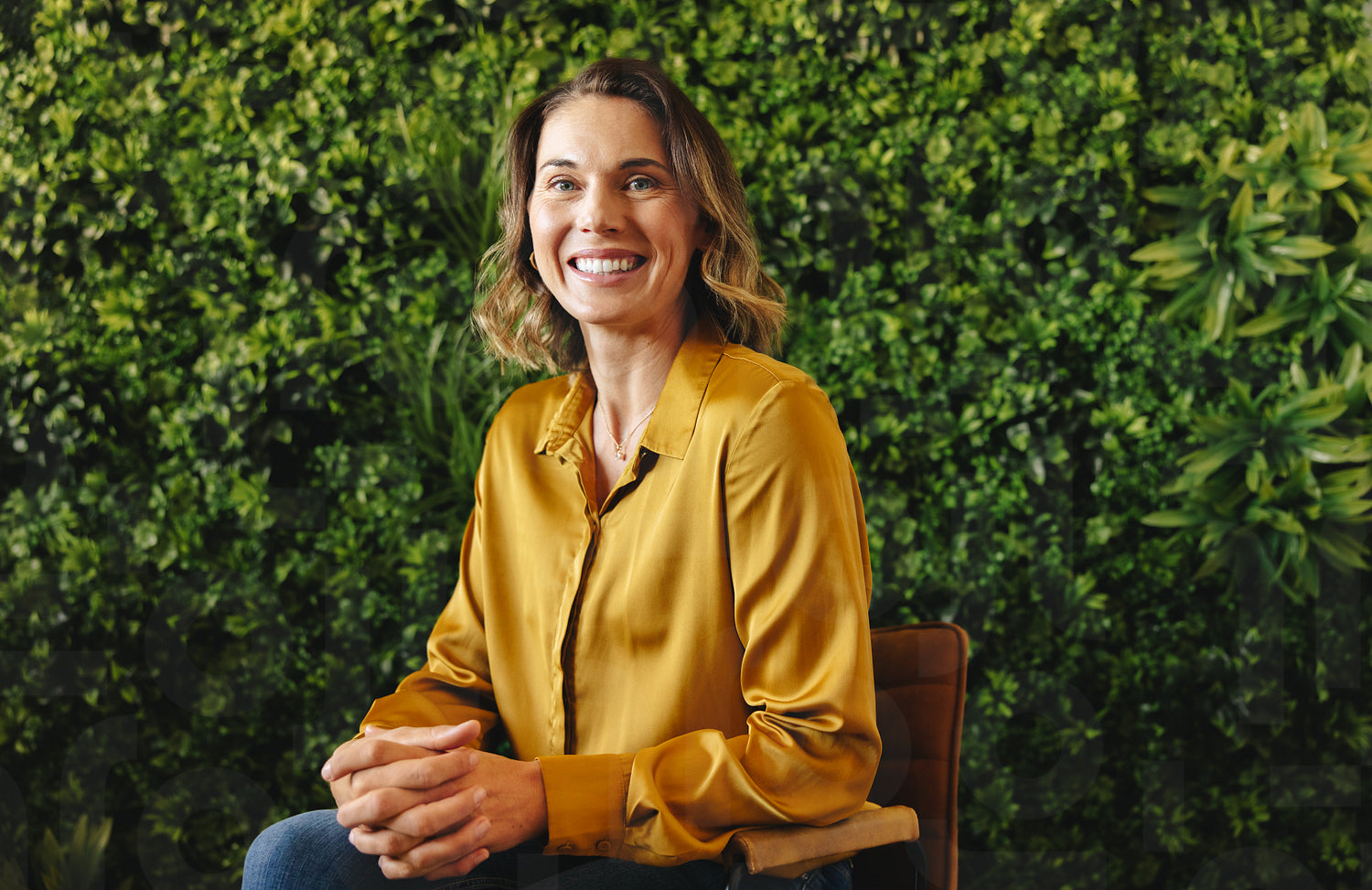 Happy female entrepreneur shows her commitment to sustainability as she sits in a green office. Professional business woman embracing environmentally responsible business practices.