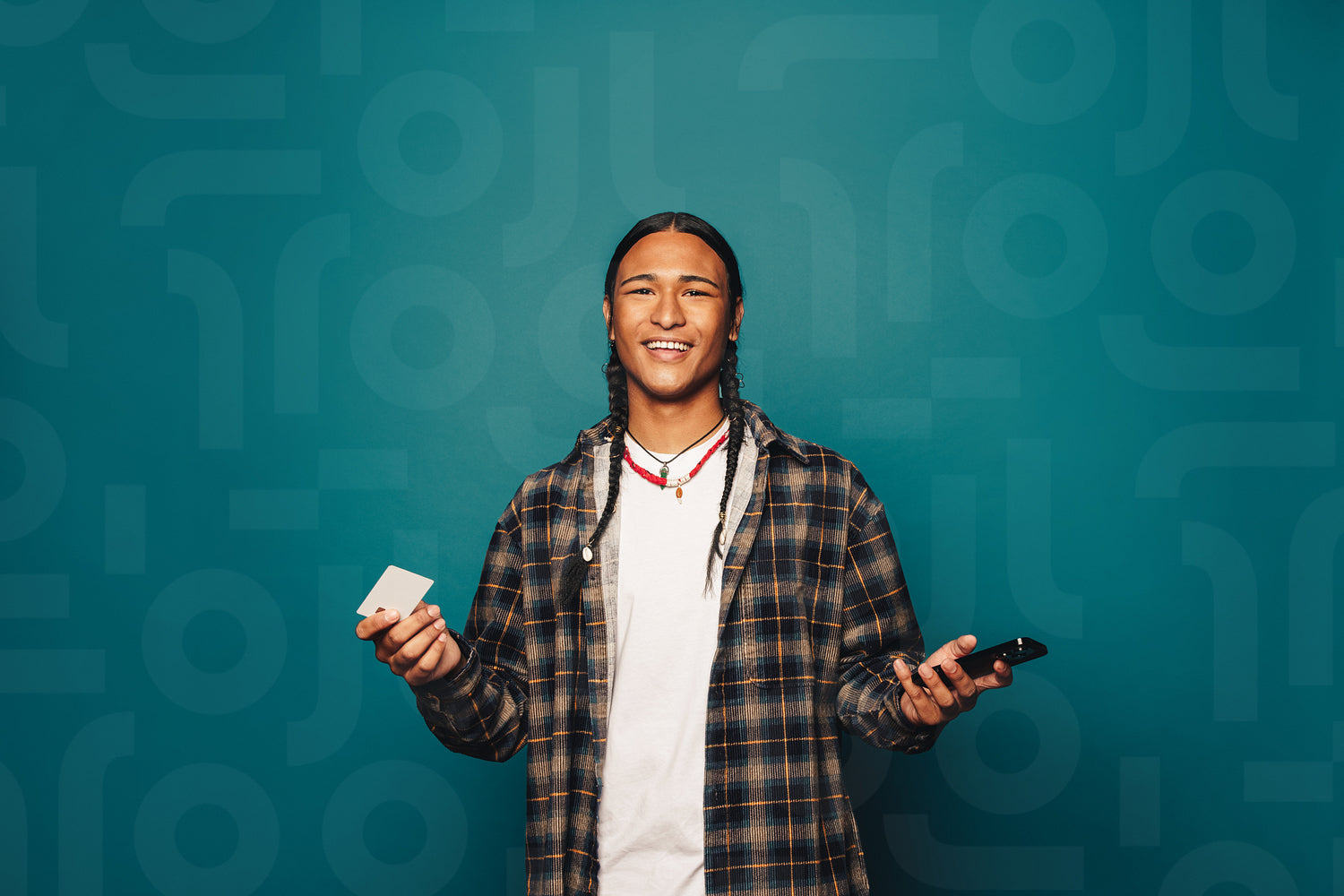 Cheerful, stylish person with braided hair stands against a blue background, holding a premium credit card and cellphone. Man representing the convenience and happiness of online banking, online payment, and mobile banking.