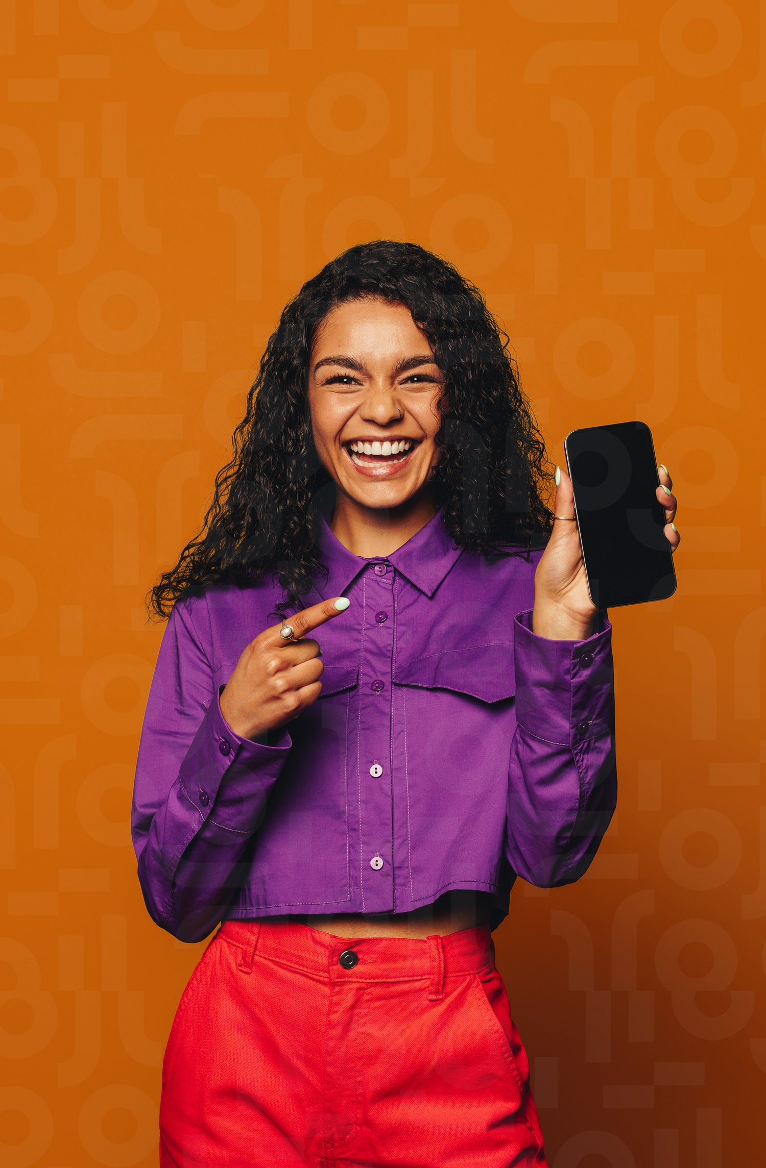 Cheerful woman with curly hair stands against a vibrant orange background, holding a mobile device. She looks at the camera, smiling, while recommending something on the modern touchscreen smartphone.