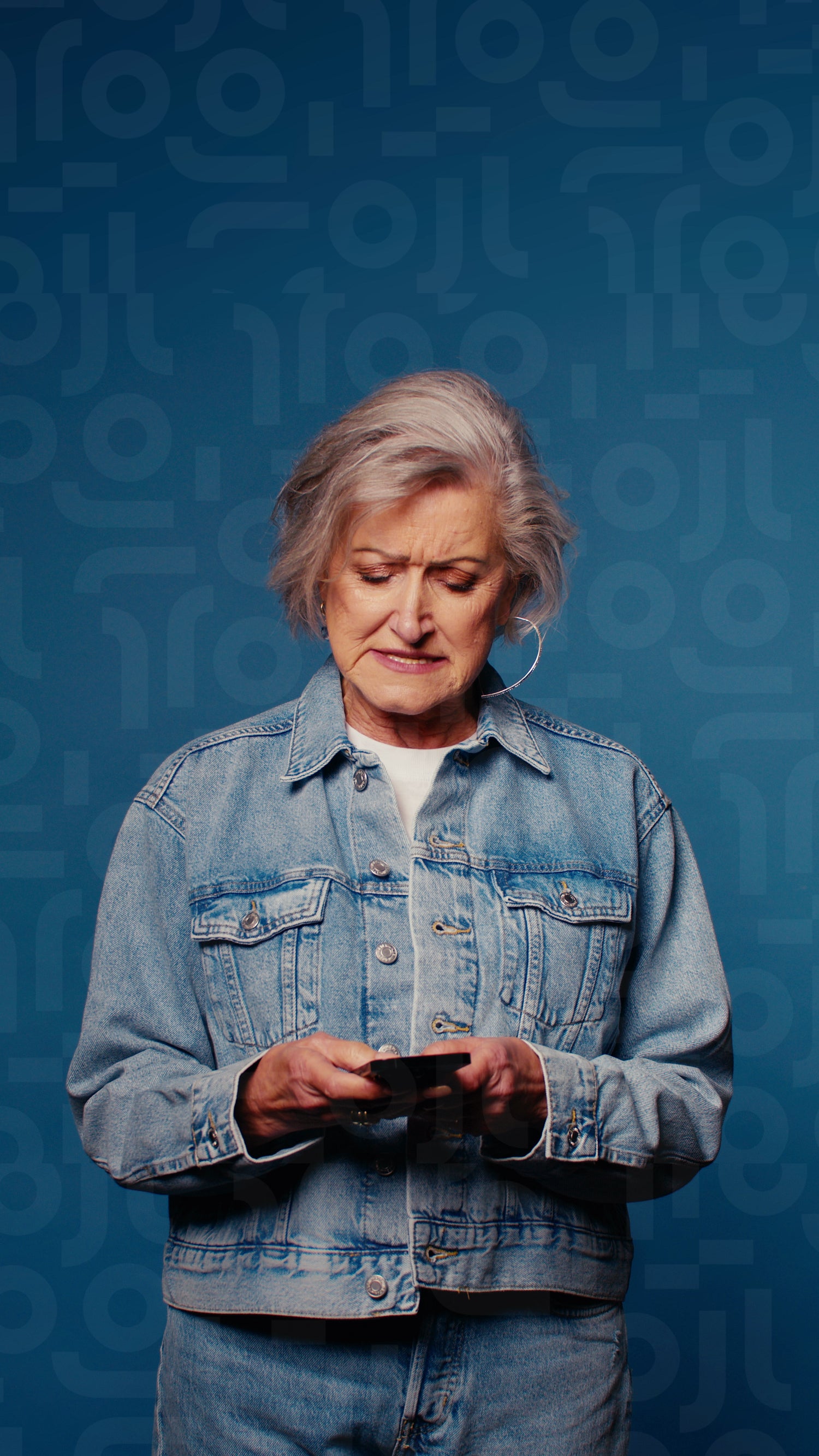 Senior woman with a concerned expression uses a smartphone. She is dressed in denim against a vibrant blue backdrop.