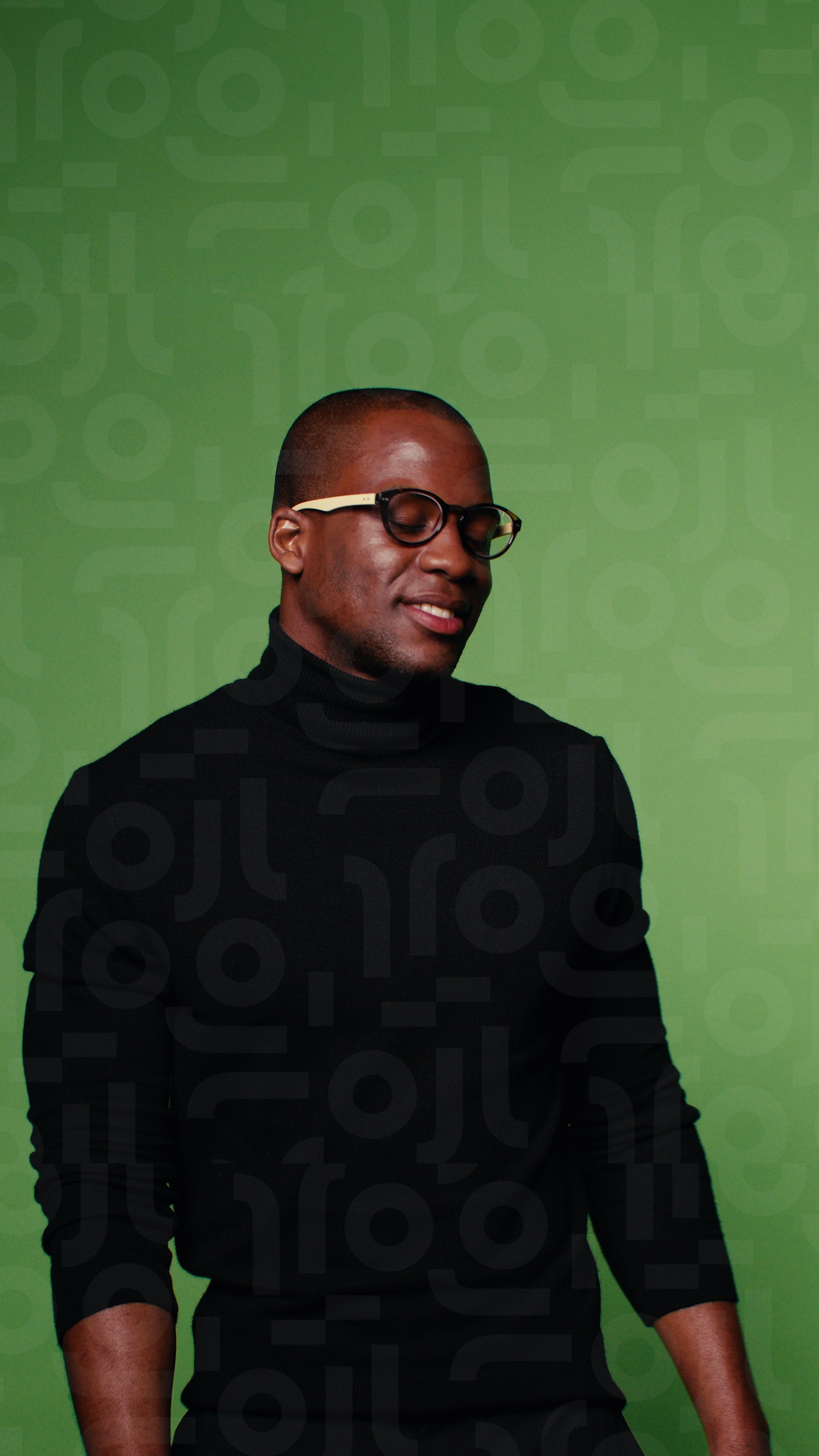 Confident man in black turtleneck and glasses against green screen background, perfect for diverse marketing campaigns.