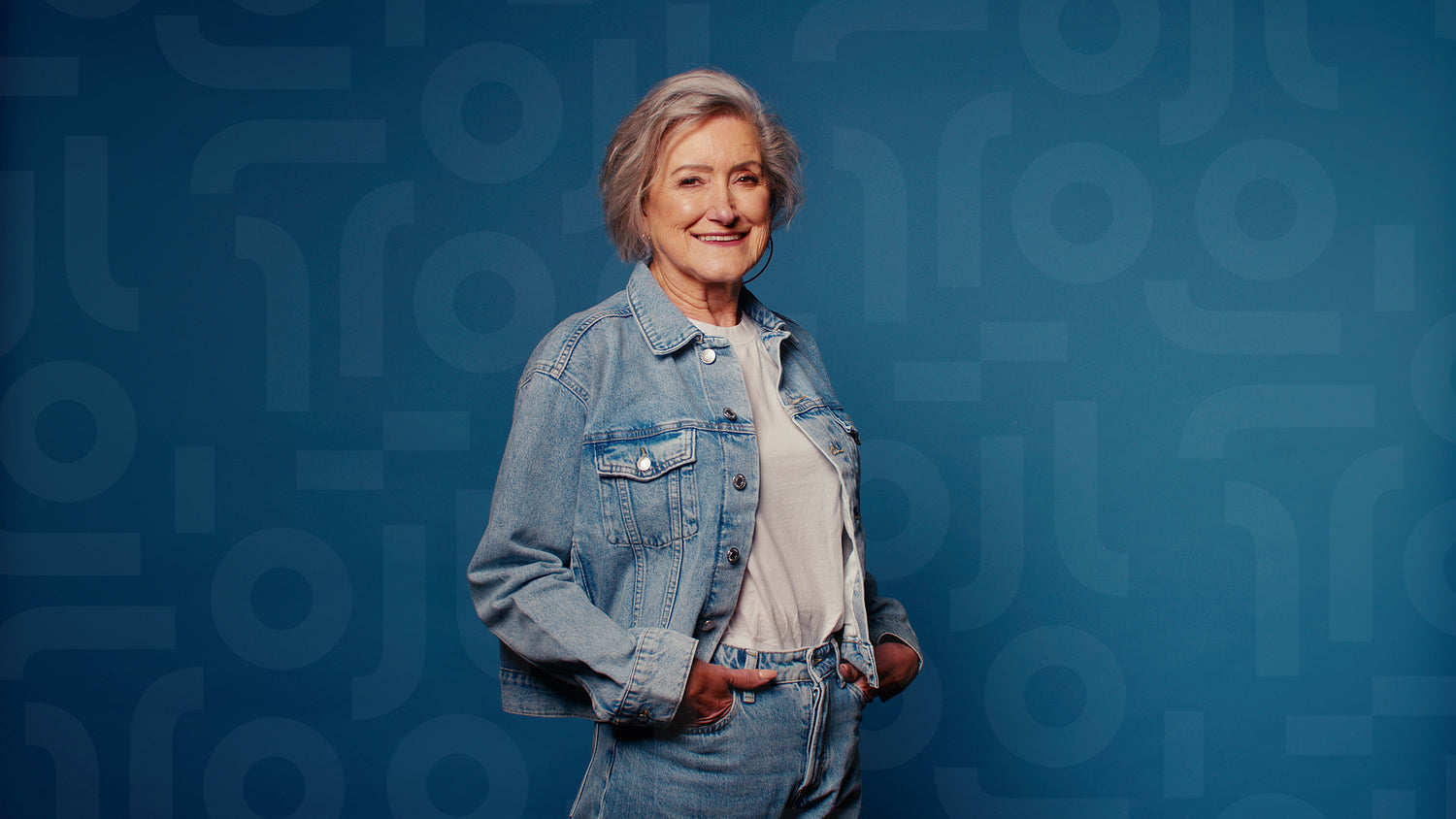 Confident senior woman smiles in denim jacket and jeans on blue background