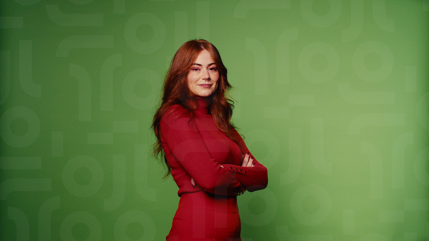 Confident woman in red smiles with arms crossed on a green screen background. Perfect for marketing, advertising, or social media content.
