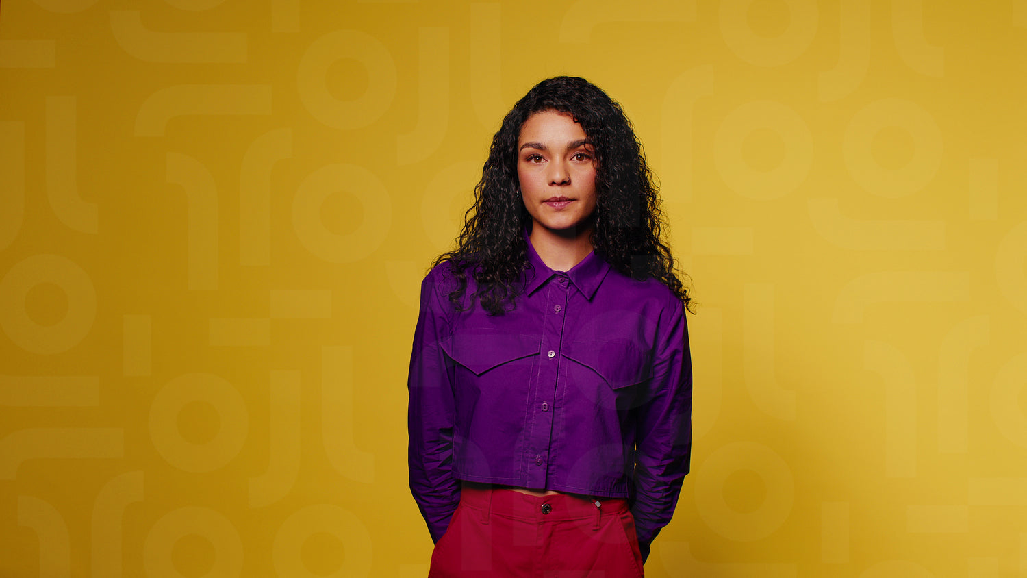 Confident young woman with curly hair places her hands on her hips in a medium shot against a vibrant yellow backdrop