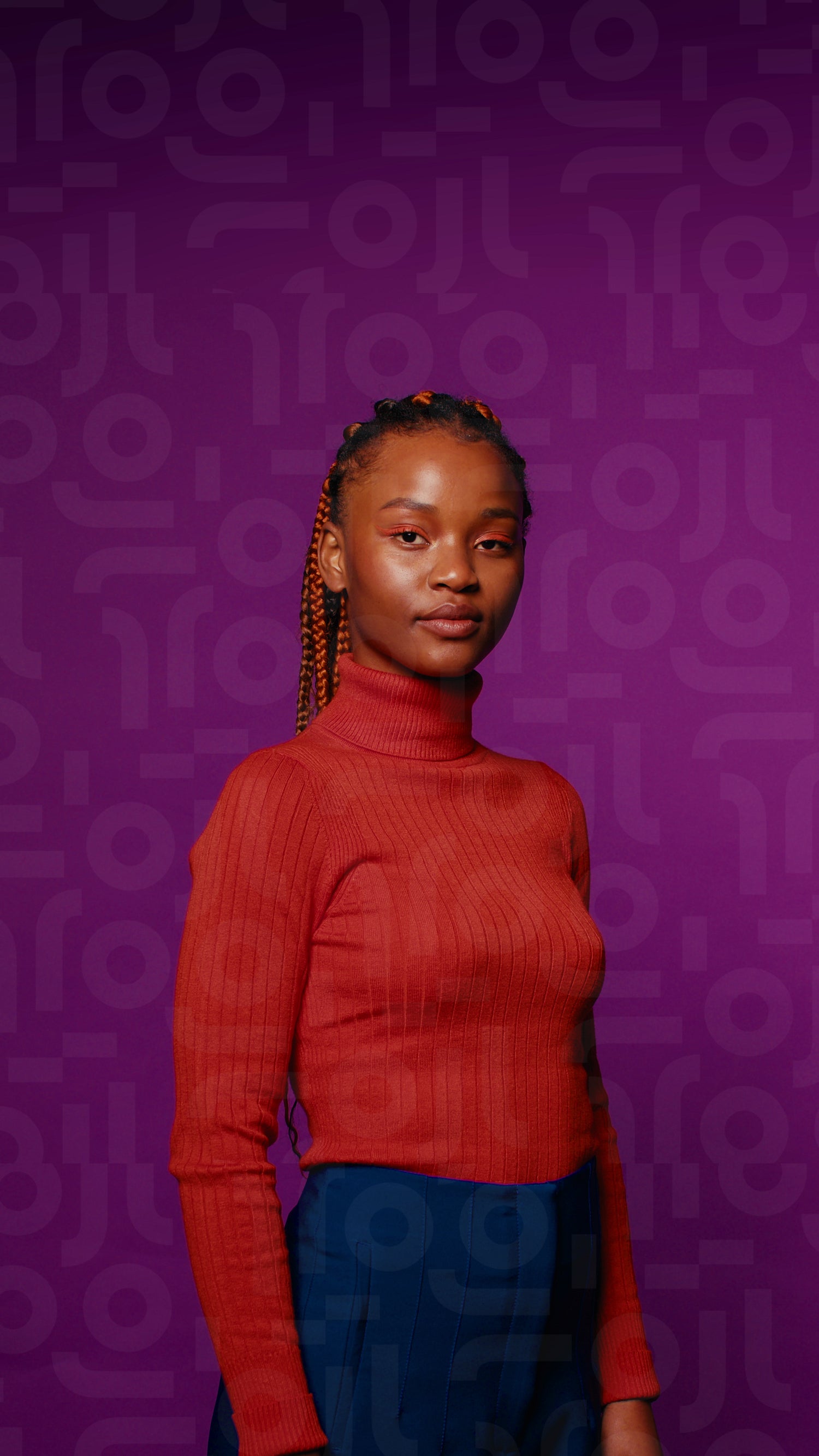 Young black woman with braids poses in a studio with a purple backdrop, wearing a turtleneck and pants. She looks directly at the camera, creating a portrait.