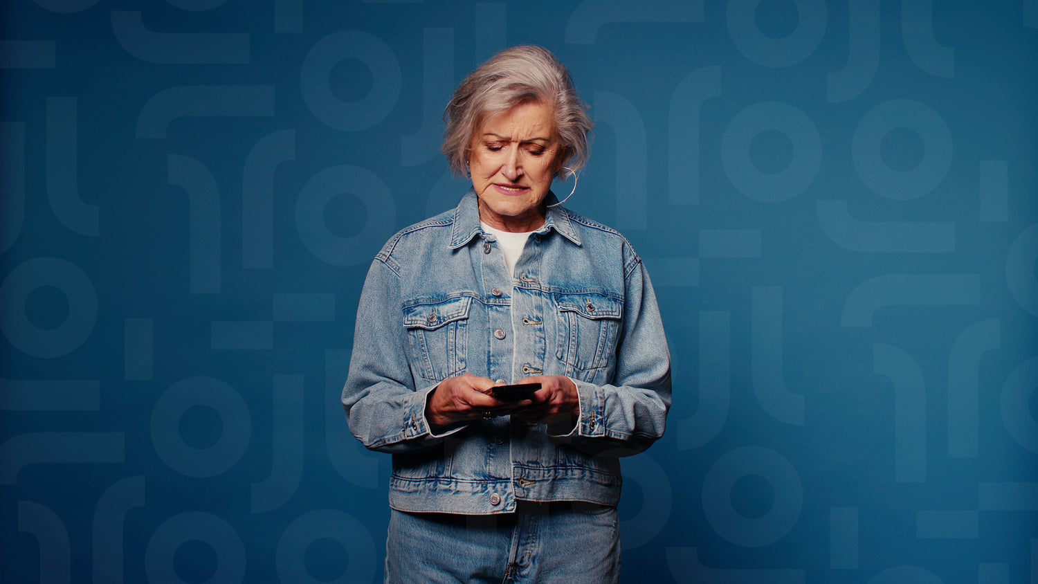 A mature woman with gray hair looks concerned while reading her phone. She wears a denim jacket and jeans against a vibrant blue background.