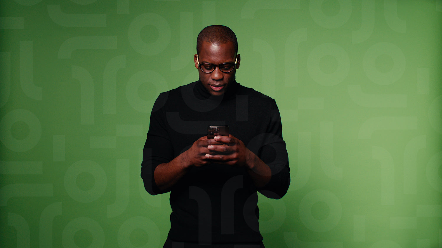 A happy African-American man in a black turtleneck and glasses using a phone to text against a green screen background. Perfect for chroma key projects.