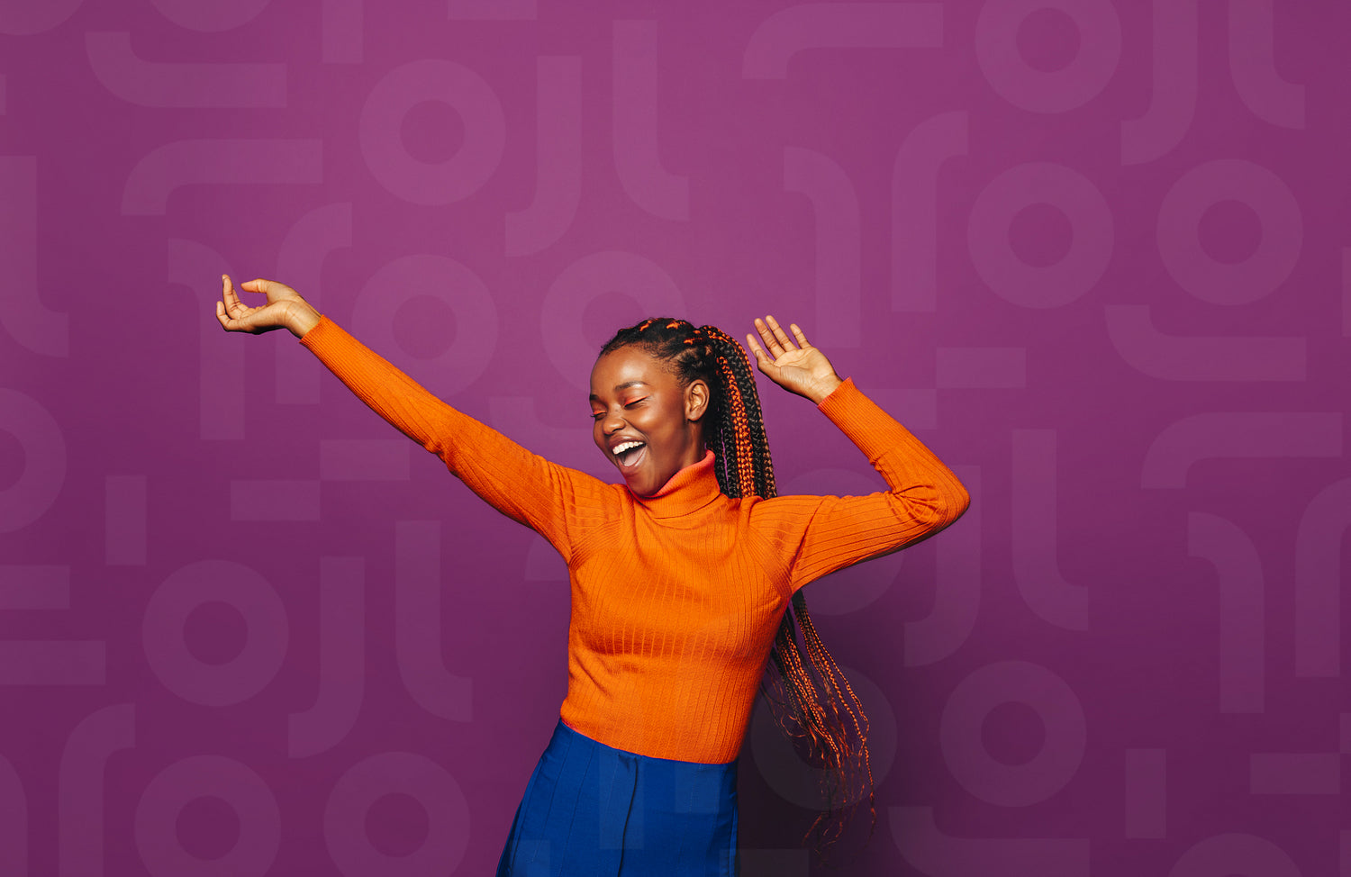 Happy african woman celebrating in colourful casual clothing against vibrant purple background