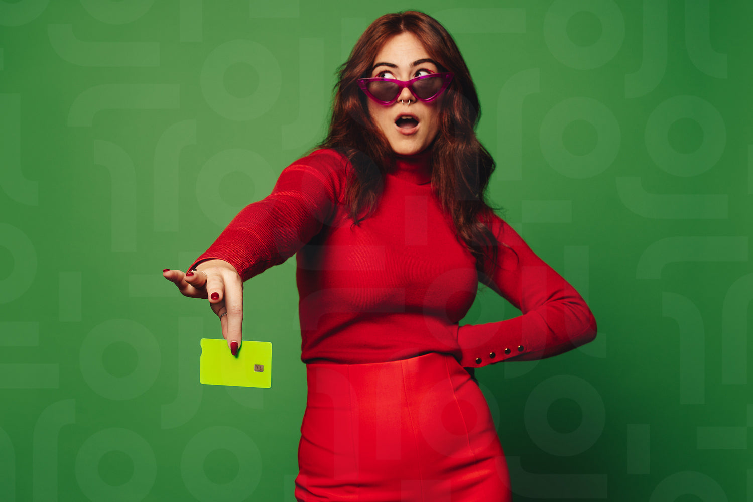 Woman with sunglasses stands on a green background, expressing shock as she experiences the convenience of cashless banking. Young woman using a contactless credit card for shopping and electronic payments.
