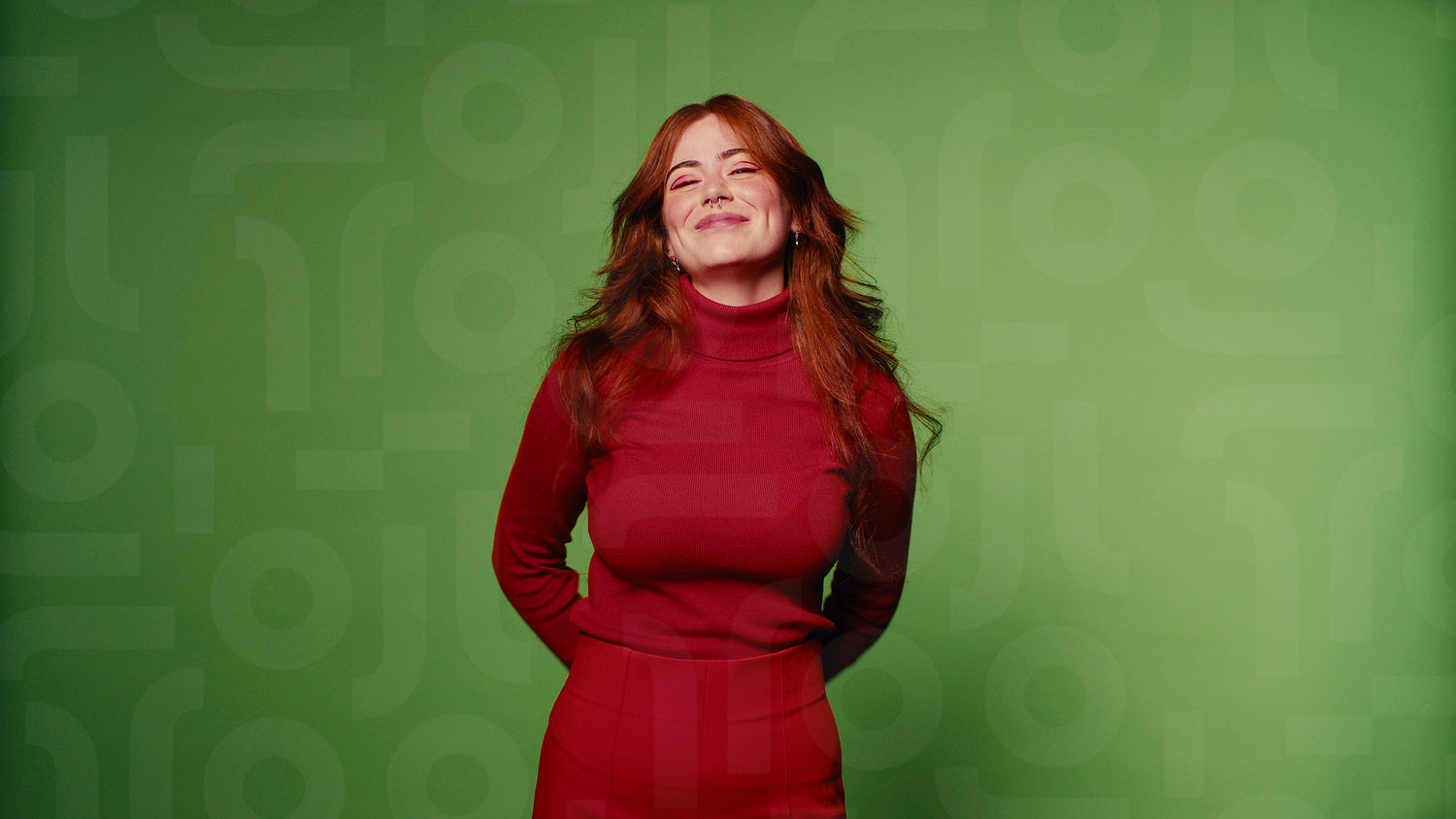 Happy friendly woman in red waving against a vibrant green screen. Perfect for commercials, presentations, or social media content.