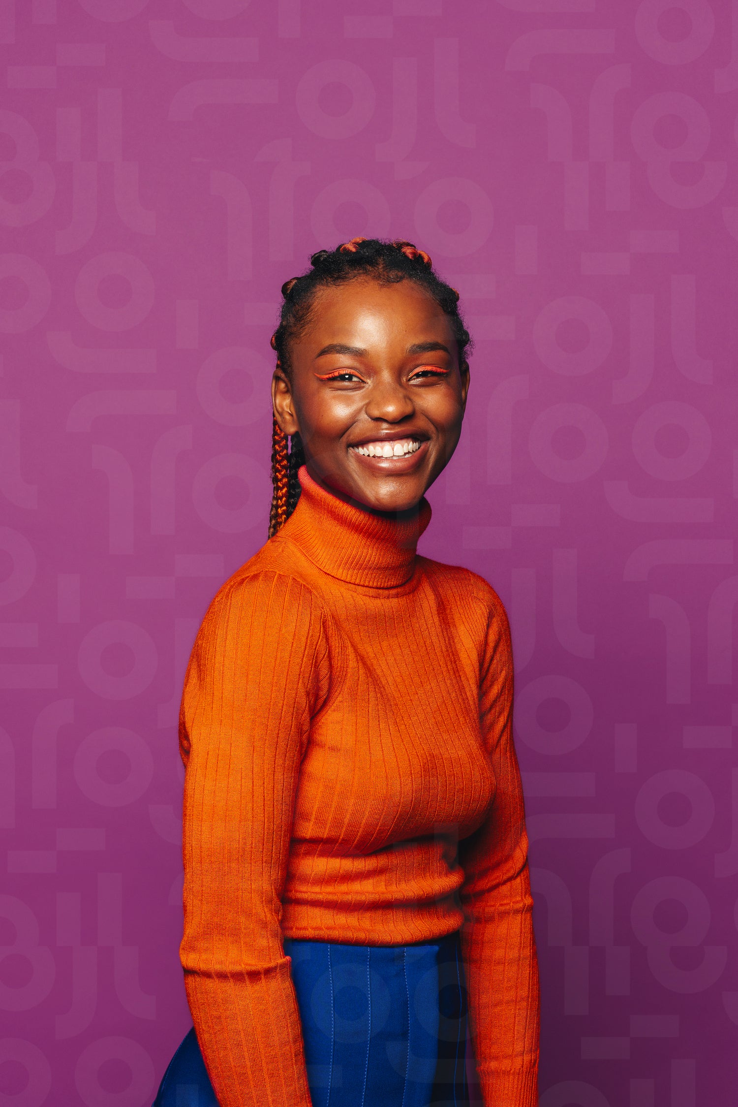 Happy, stylish woman with vibrant two-tone braids stands against a purple background. She wears casual clothing, including jeans and a polo neck, exuding confidence and a cheerful demeanor. Her fashionable makeup and trendy hairstyle reflect her vibrant lifestyle.