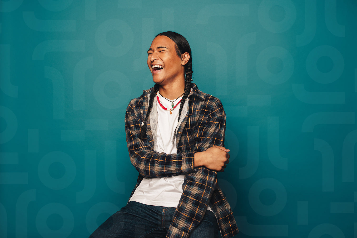 Happy young man with braided hair sits and smiles, wearing casual clothing and stylish jewelry. His carefree demeanor and long hair add to his happy appearance against a blue studio backdrop.