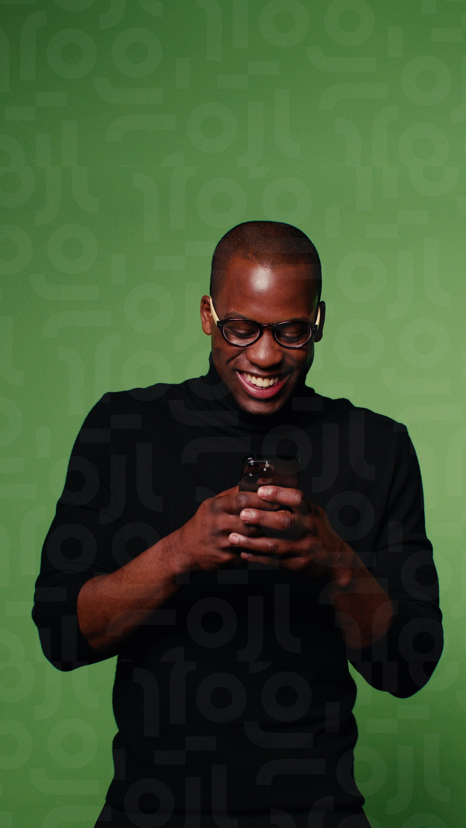 An African-American man smiles and laughs while looking at his phone. He is standing in front of a green screen, wearing a black turtleneck and glasses.