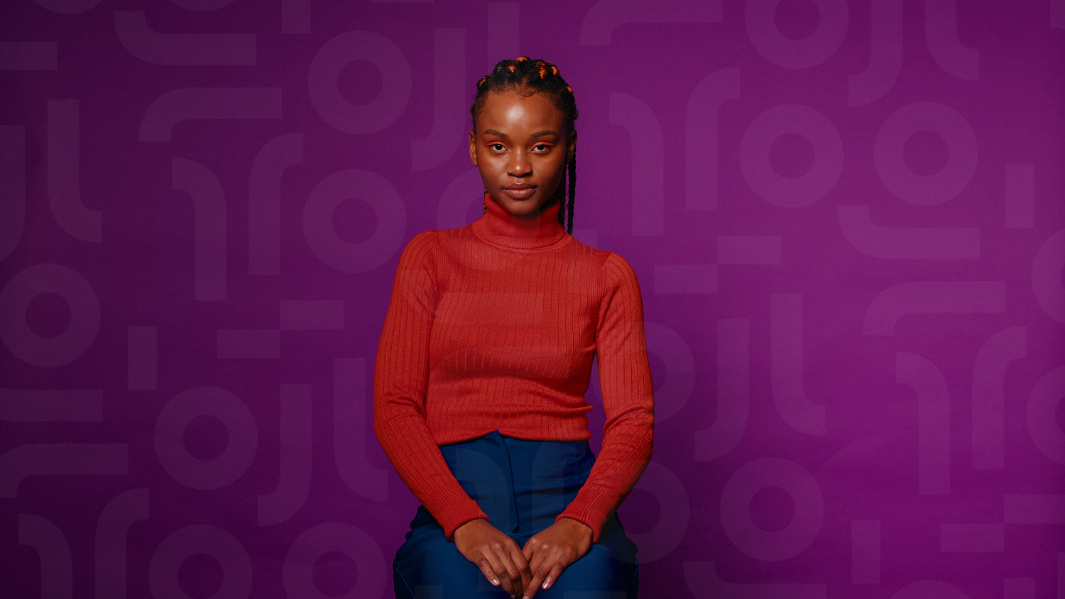Young woman sits against a vibrant violet backdrop, her serene expression conveying confidence and composure, in this medium close-up studio shot