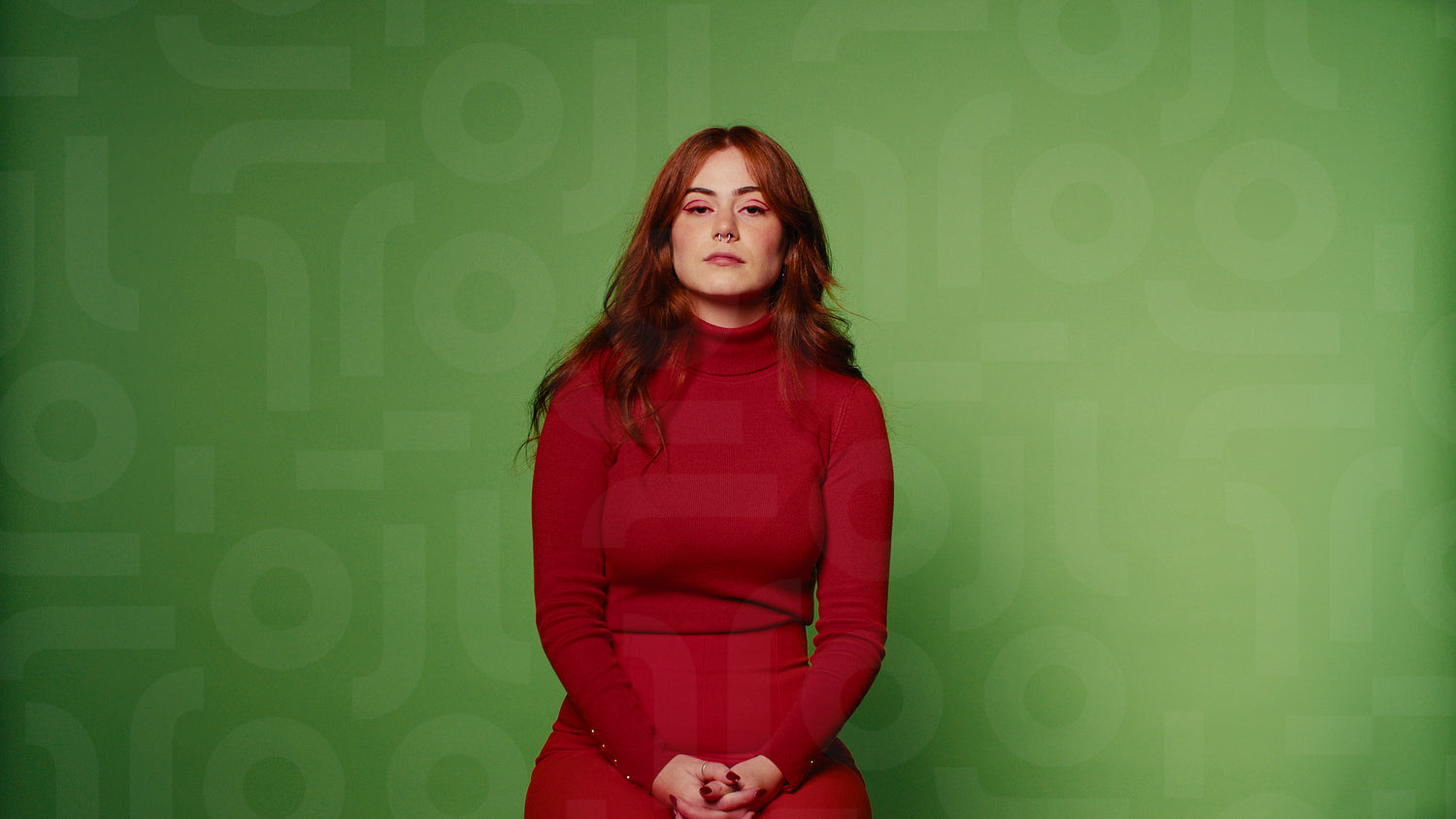 Confident young woman with long red hair and stylish makeup sits against a green screen background, looking serious, and smiles warmly.