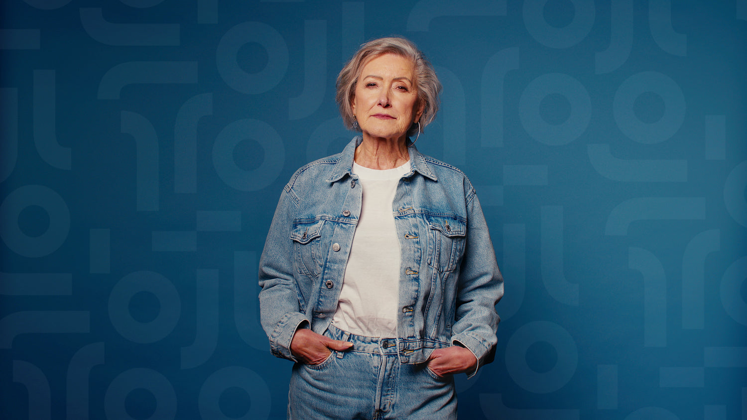Confident senior woman in denim jacket and jeans poses on blue studio backdrop. Her serene expression reflects wisdom and experience.