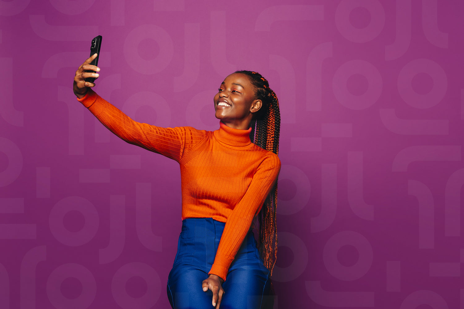 Smiling african woman taking a selfie with smartphone on a vibrant purple background