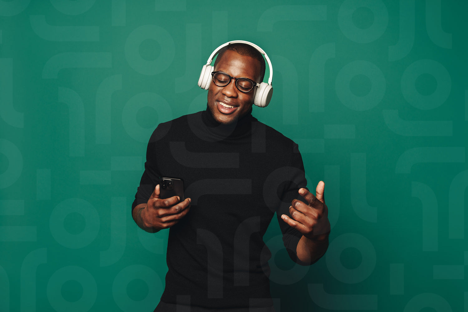 Young man with glasses and casual clothing dances with joy on a green background. He is holding a smartphone and wearing a stylish headset, listening to music. His trendy moves and happy expression reflect his love for streaming songs online.