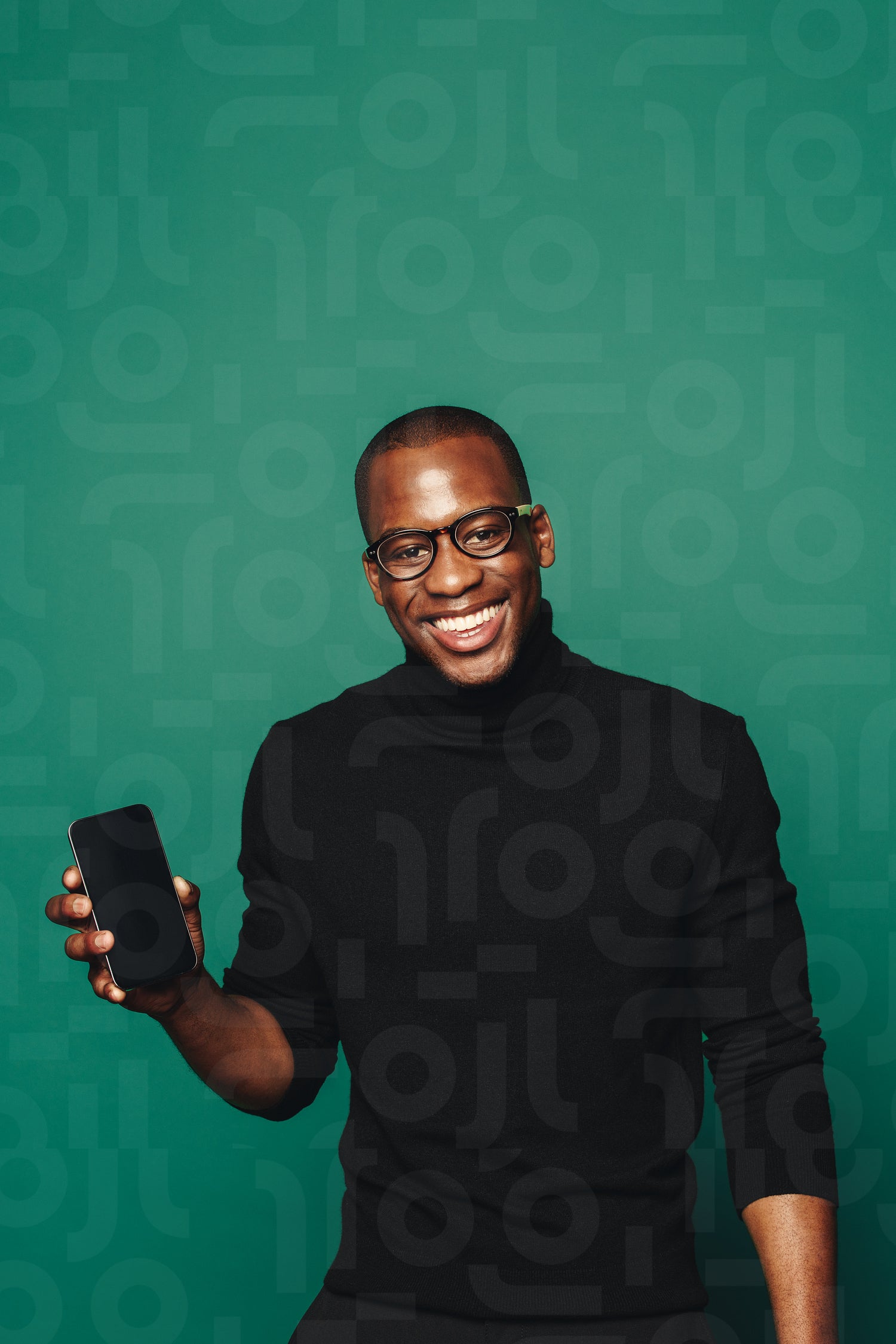 Stylishly dressed in casual clothing, a young man holds a trendy mobile phone against a vivid green background. With confident and happy demeanor, he showcases the device's touchscreen capabilities, effectively recommending an app for communication or advertising purposes.